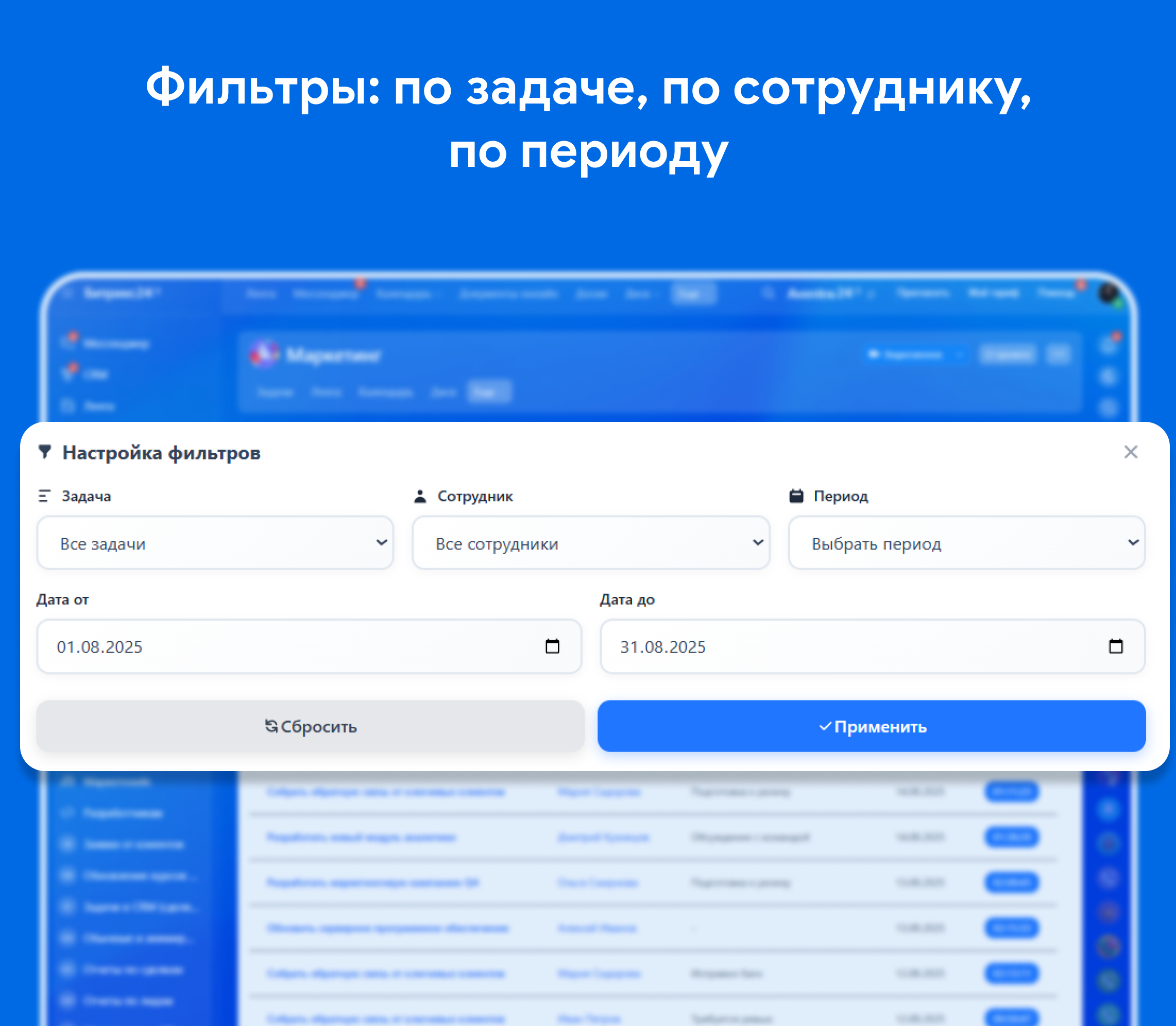 Фильтры: по задаче, по сотруднику, по периоду (весь период / текущий месяц / прошлый месяц / произвольные даты).