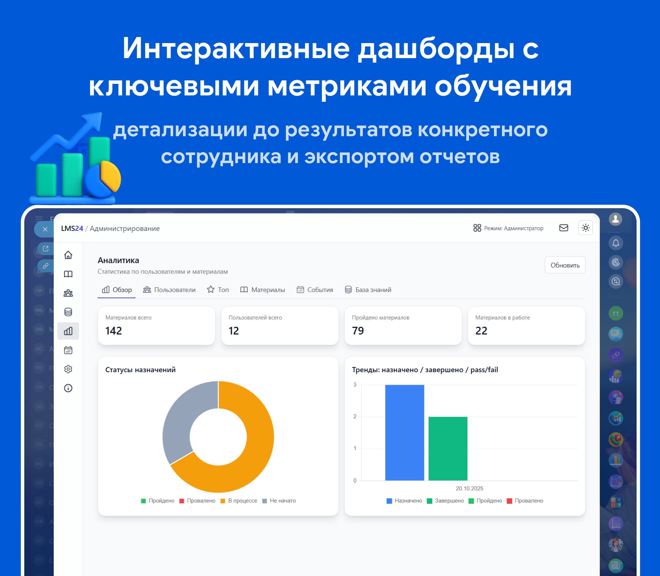 - Администратор/модератор — управление контентом, назначениями, аналитикой.
