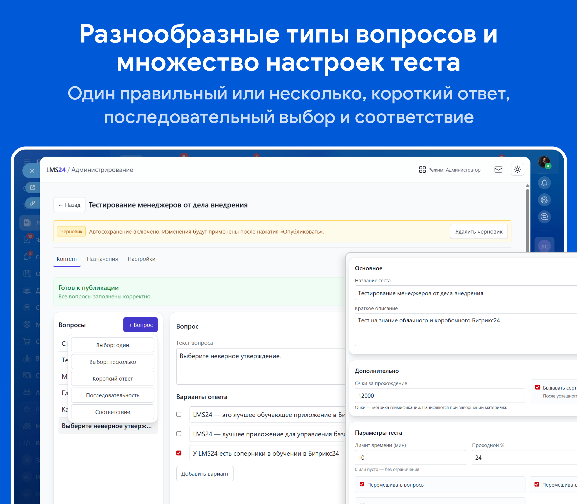 Типы вопросов: один или несколько правильных ответов, короткий ответ, соответствие, последовательность.