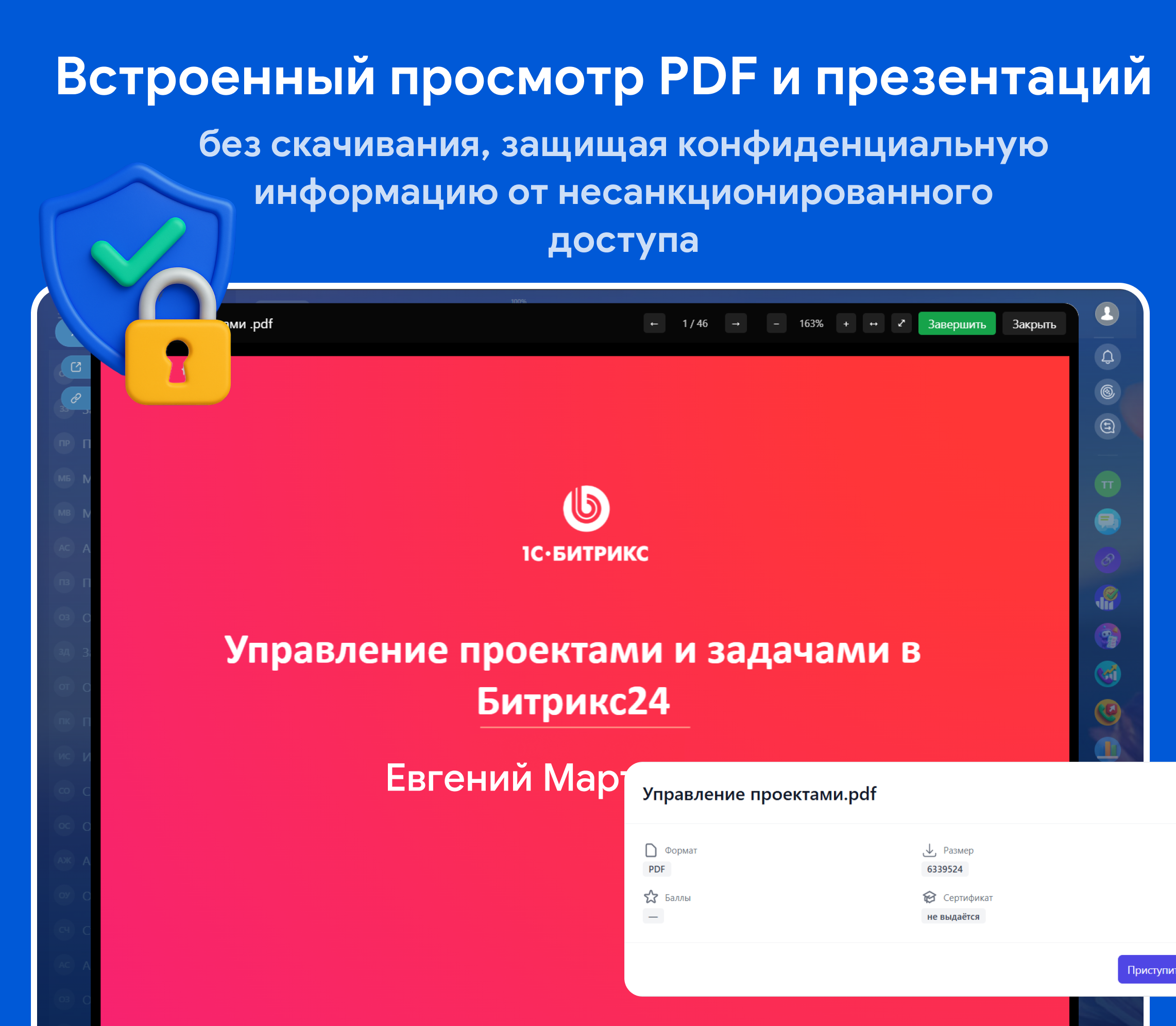 Защищённый просмотр файлов: презентации и PDF открываются в встроенном viewer’е без скачивания.