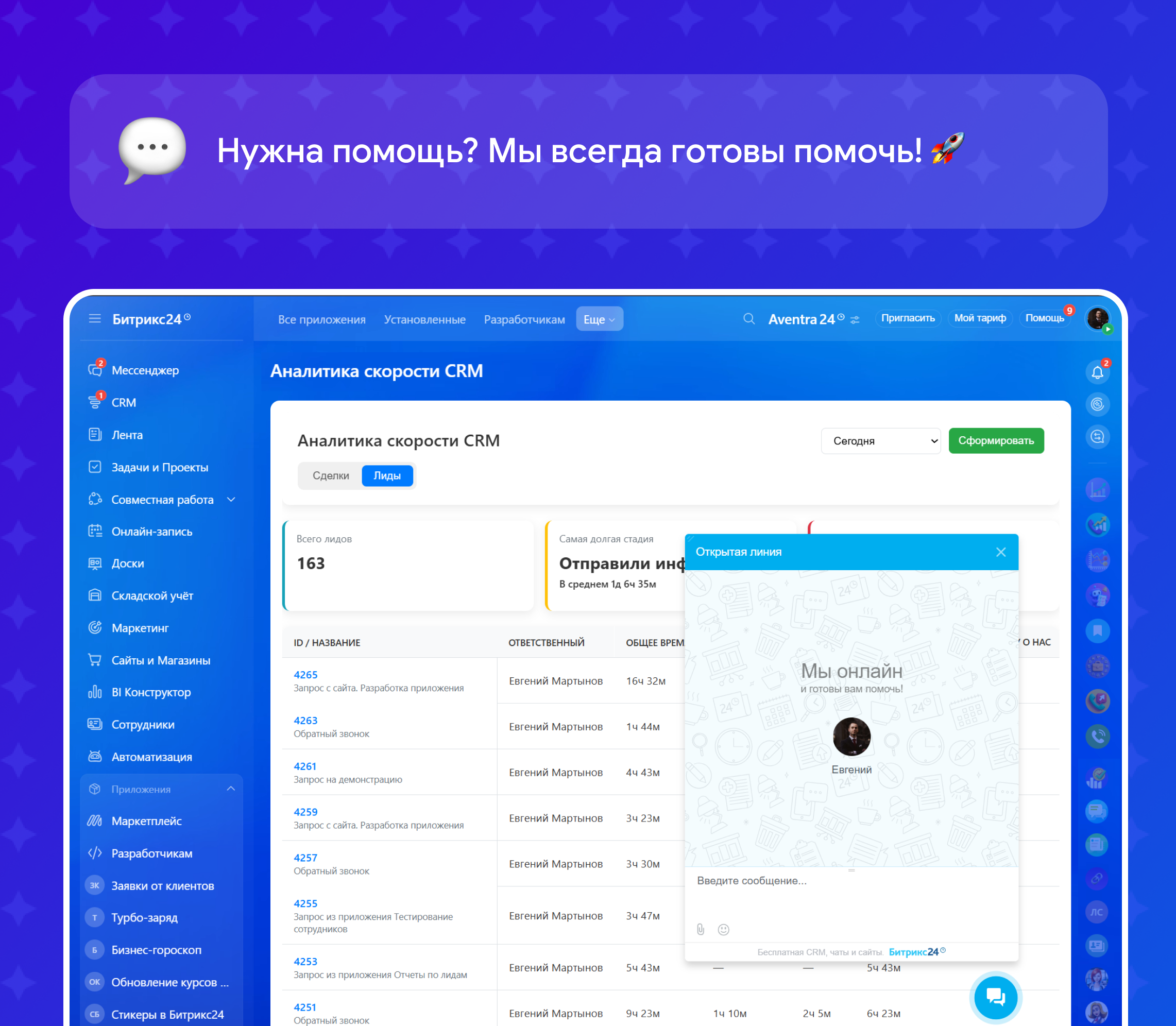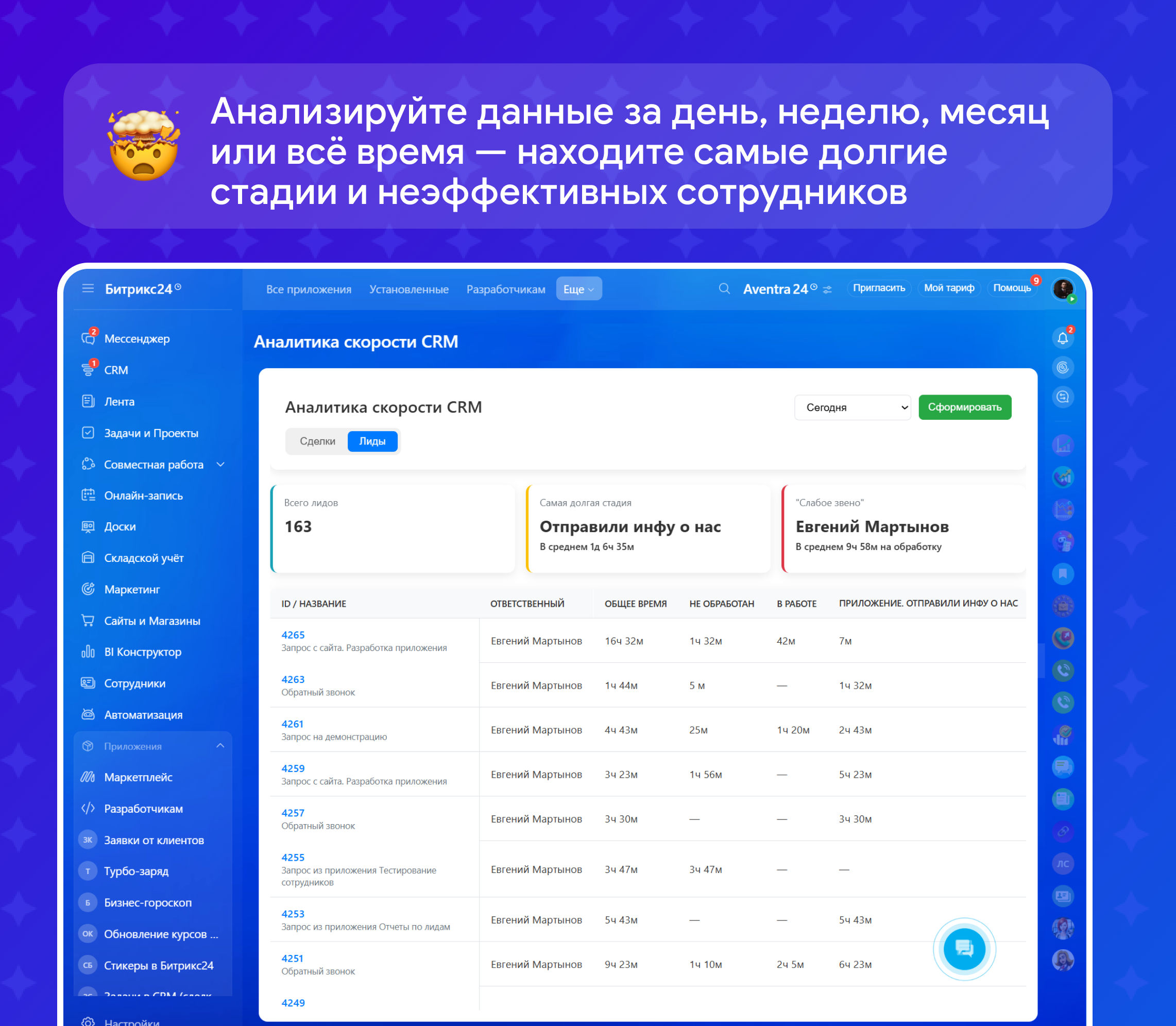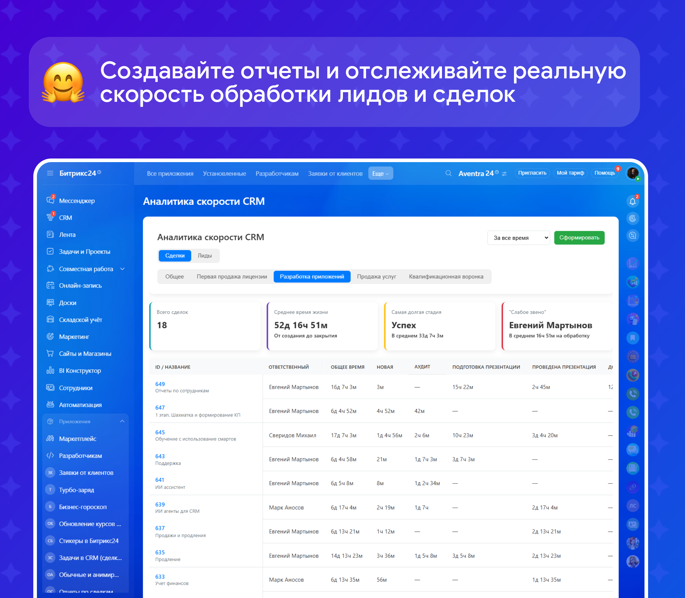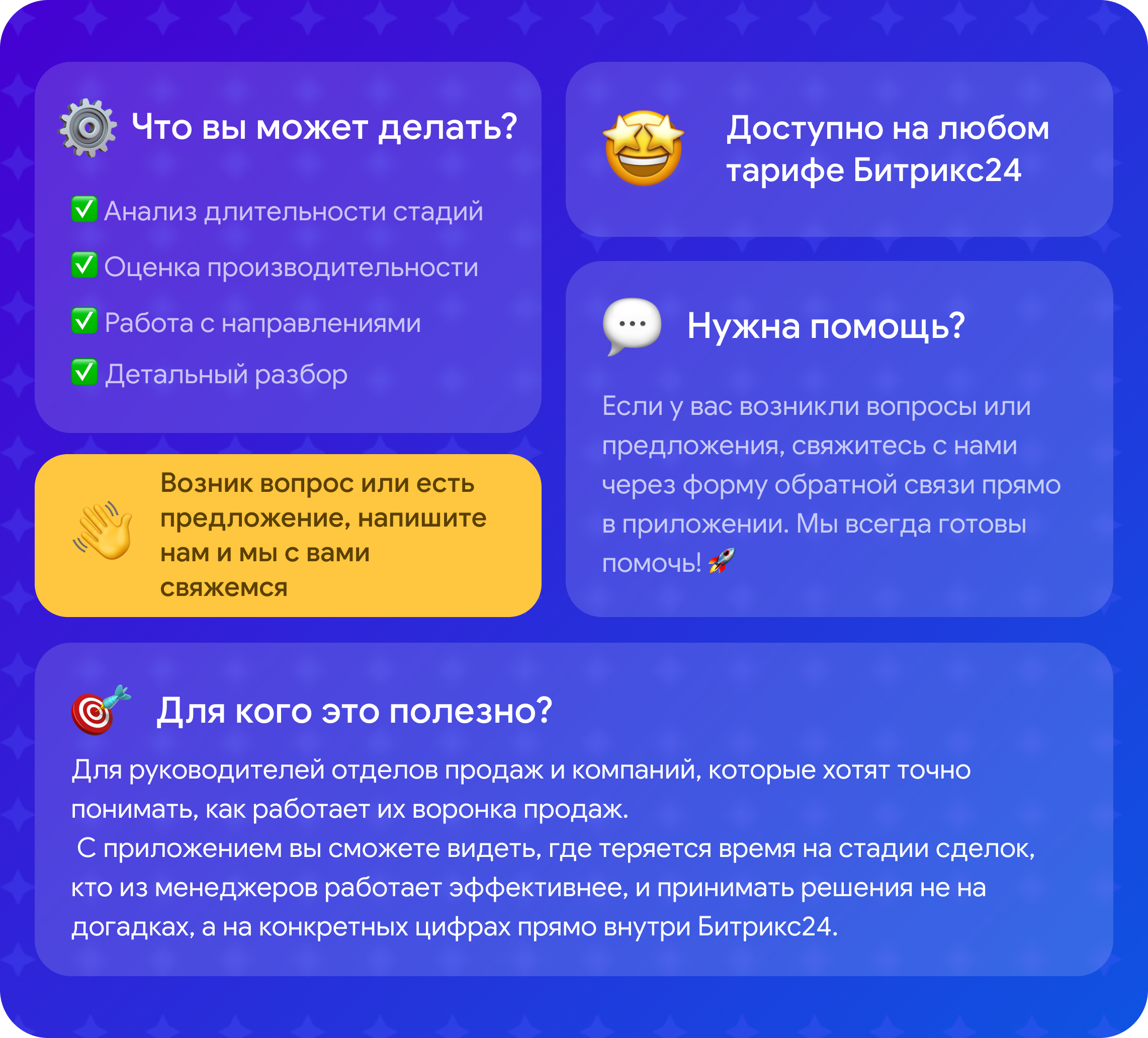 Приложение помогает руководителям отделов продаж и директорам понять реальную скорость обработки лидов и сделок, выявить «зависшие» этапы и определить самых эффективных менеджеров. Прекратите гадать, почему сделки затягиваются. Получите точные данные в цифрах, чтобы принимать взвешенные управленческие решения прямо внутри Битрикс24.