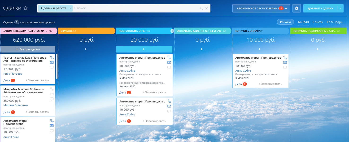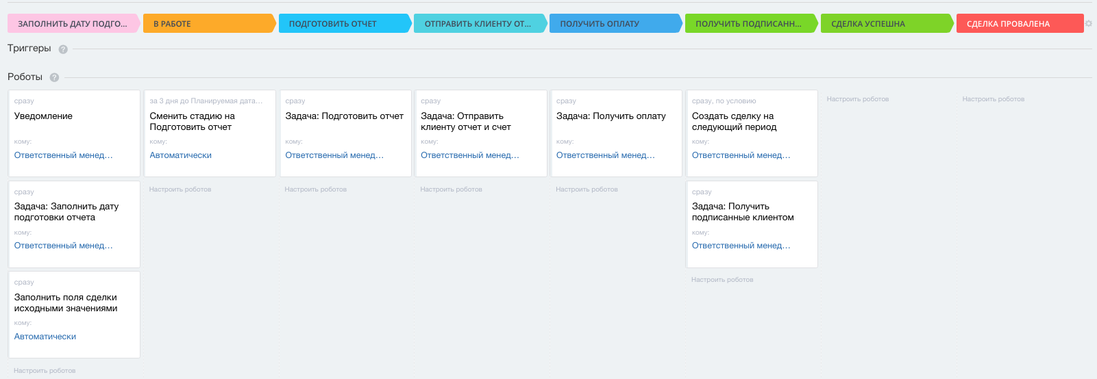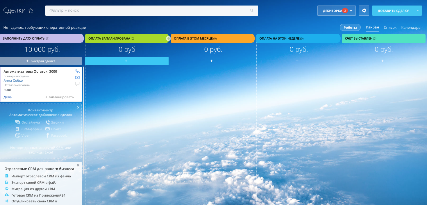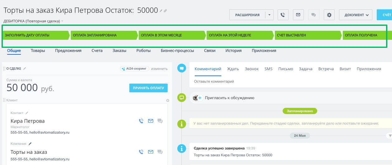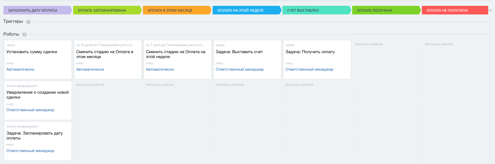 - с автоматической сменой стадий в зависимости от даты запланированного платежа