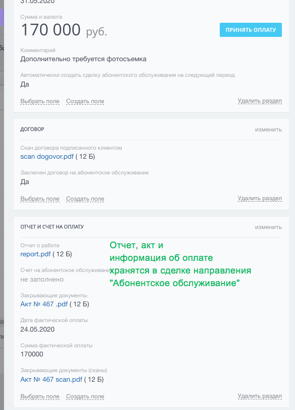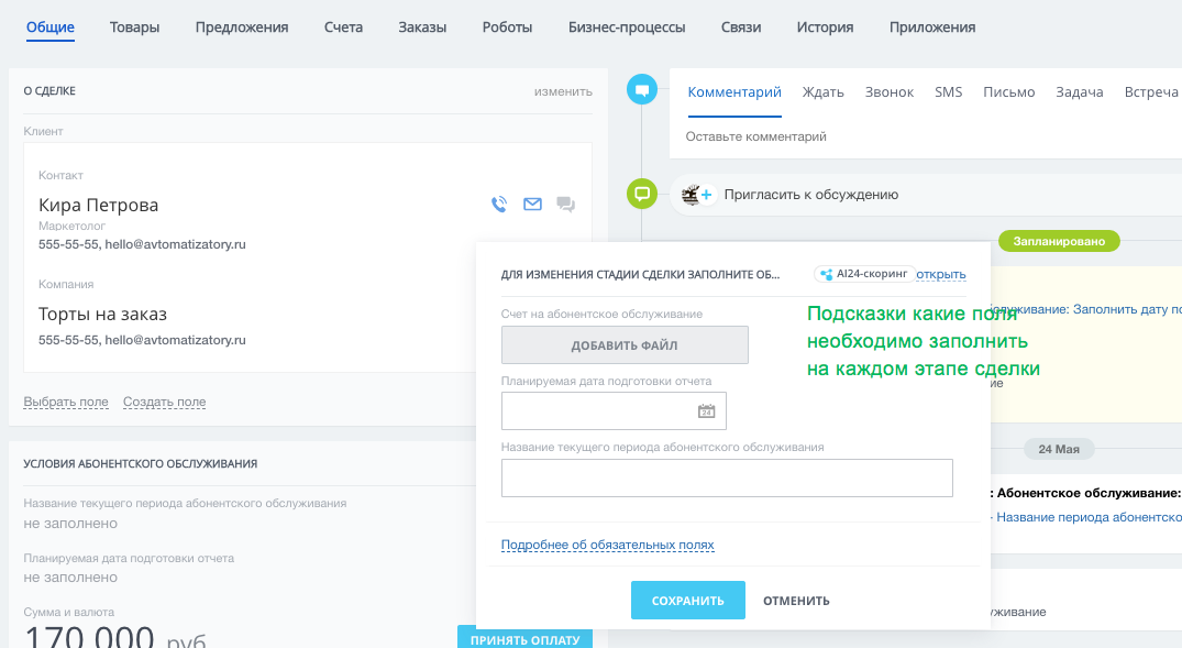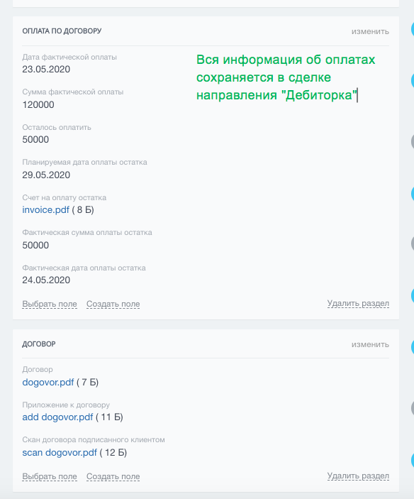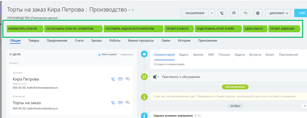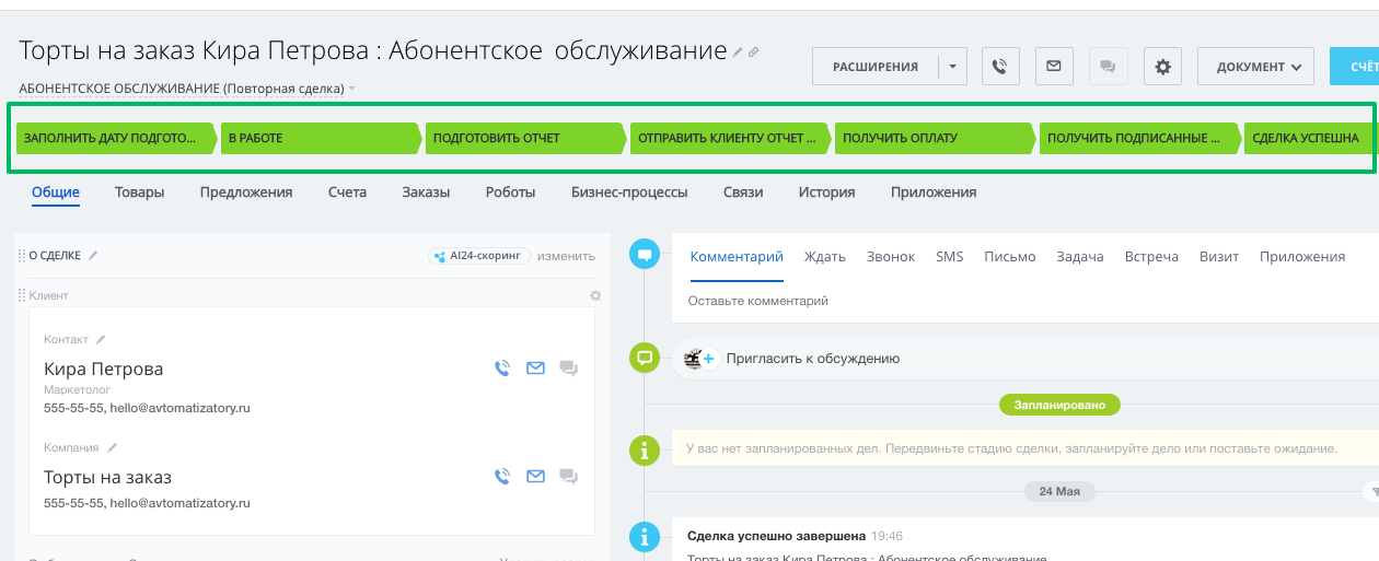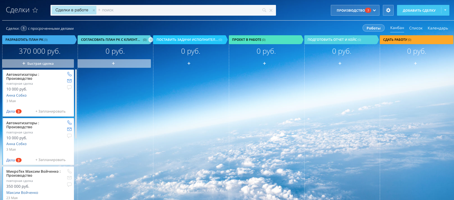 - с автоматической сменой стадий в зависимости от даты запланированного платежа