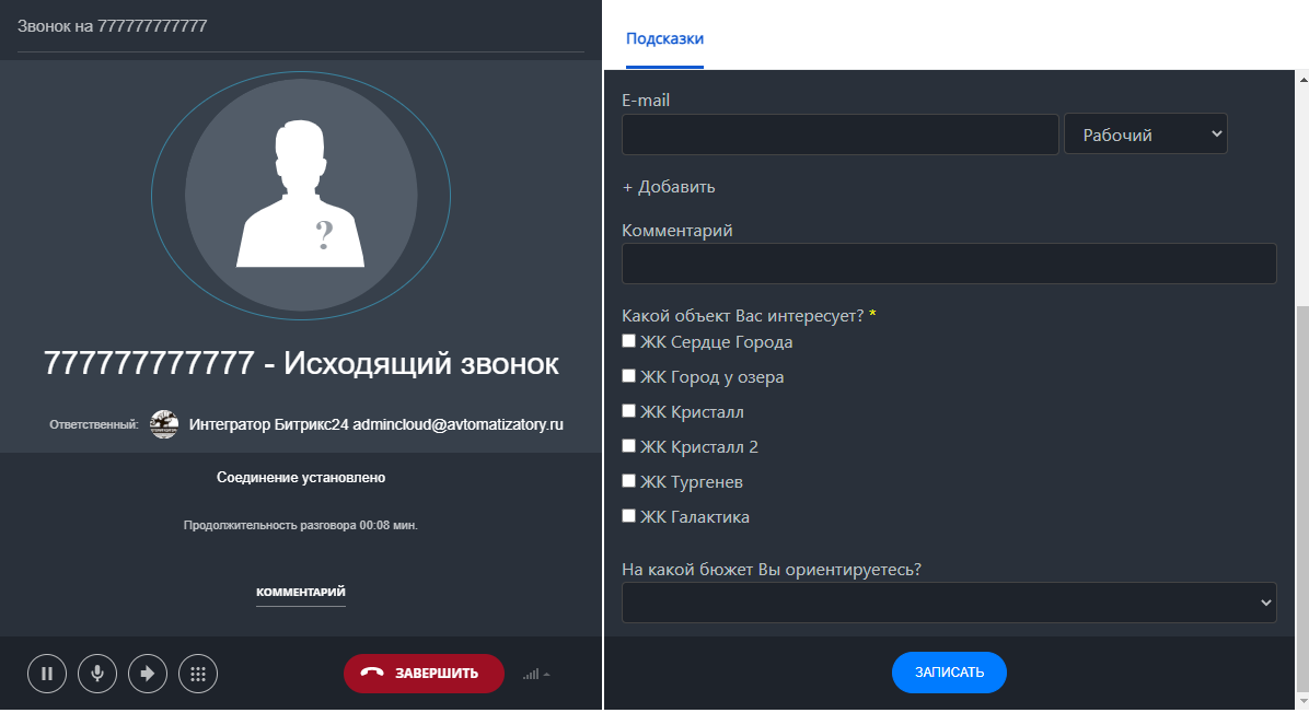Эти поля вы можете заполнять как в карточке , так и в форме звонка во время разговора с клиентом.