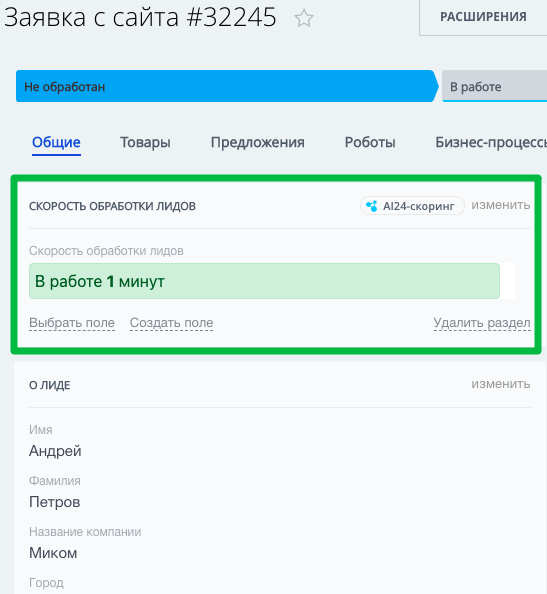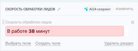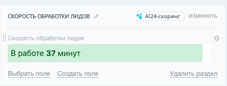 В карточке лида, в поле "Скорость обработки лидов" вы увидите как долго этот лид находится в работе на текущий момент или за какой срок он был обработан, если лид уже сконвертирован или забракован.