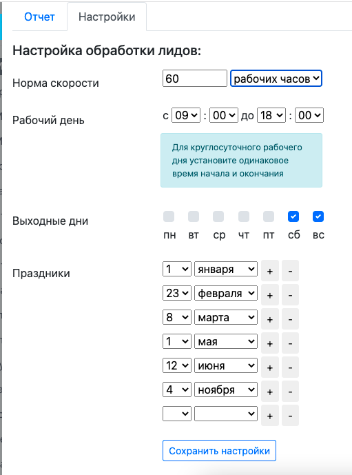 Для того чтобы изменить норму обработки лидов , перейдите на страницу приложения в раздел "Настройки"