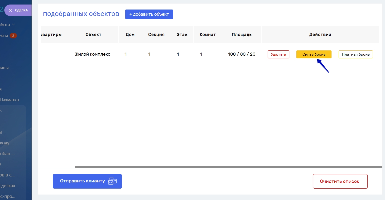 При выборе кнопки “Очистить список” в правом нижнем углу в списке объектов – происходит массовое удаление выбранных объектов списка и бронь с них снимается.