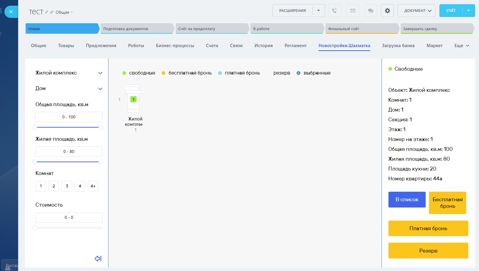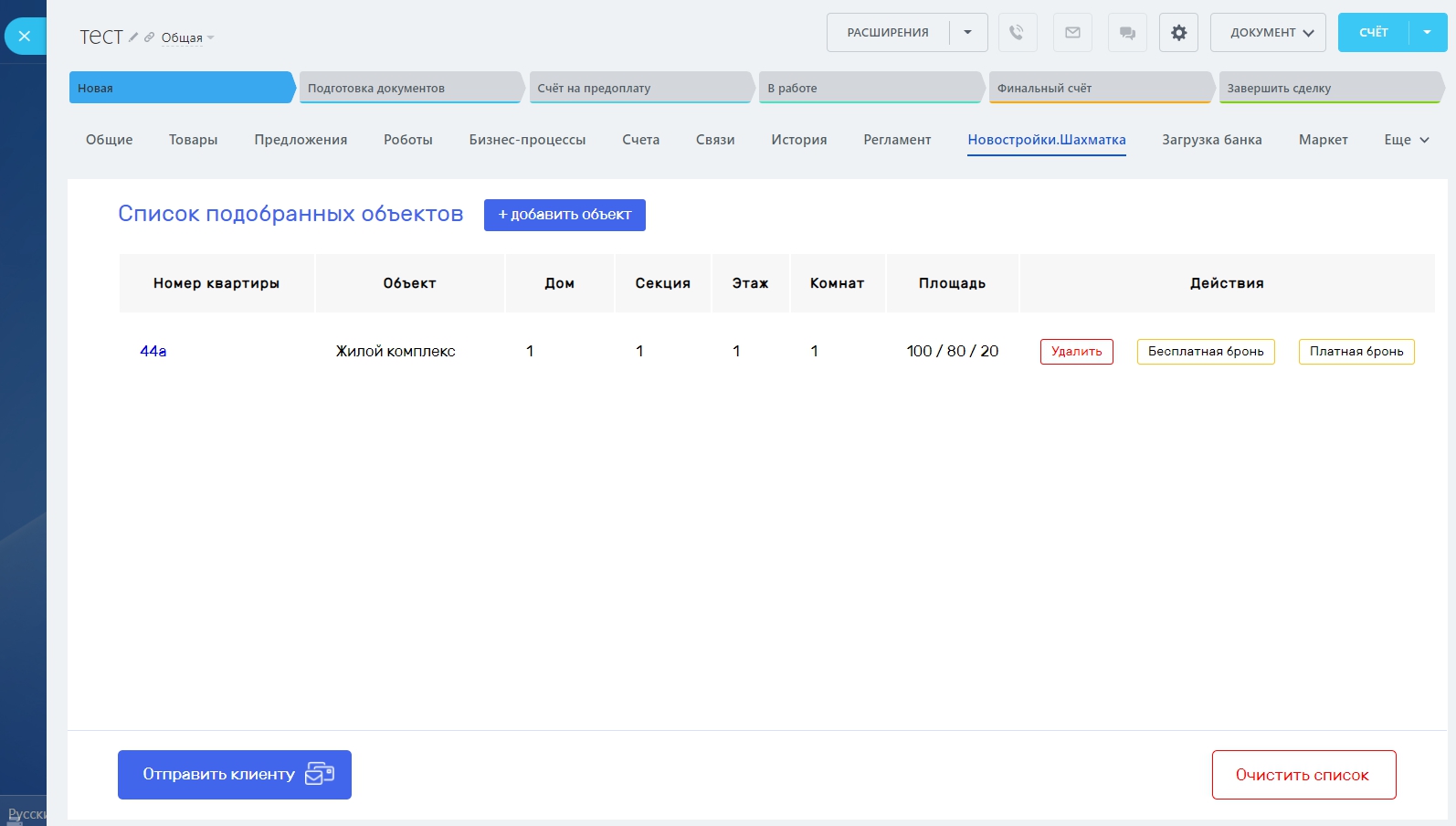 Необходимо перейти в карточку сделки на вкладку “Новостройки.Шахматка”