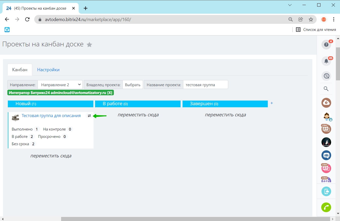 Зажмите левую кнопку мыши и просто перетащите проект на нужную стадию .