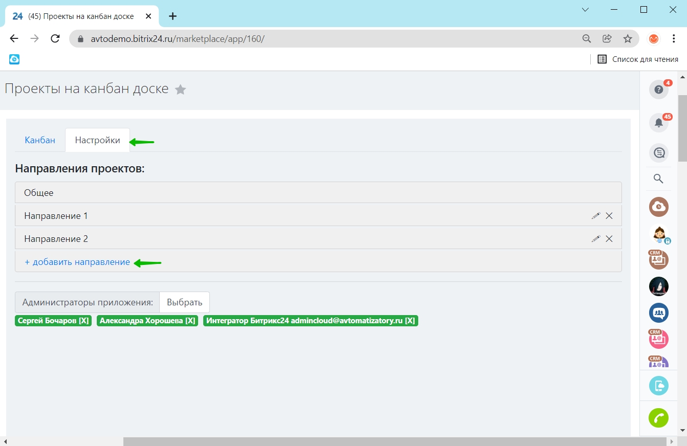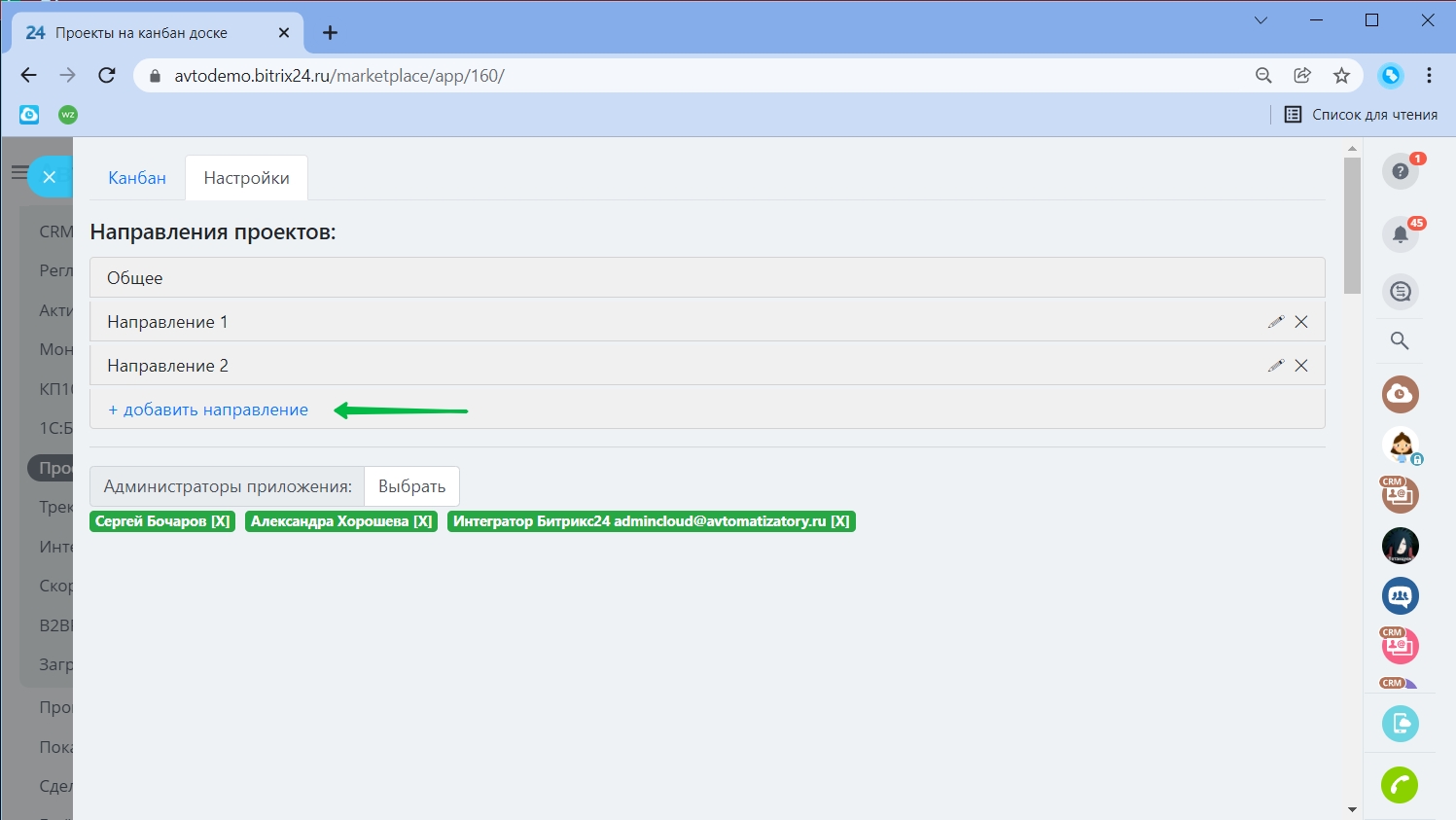 В разделе администраторов перечислены сотрудники, у которых есть доступ к настройкам приложения, т.е. возможность добавлять и удалять направления.