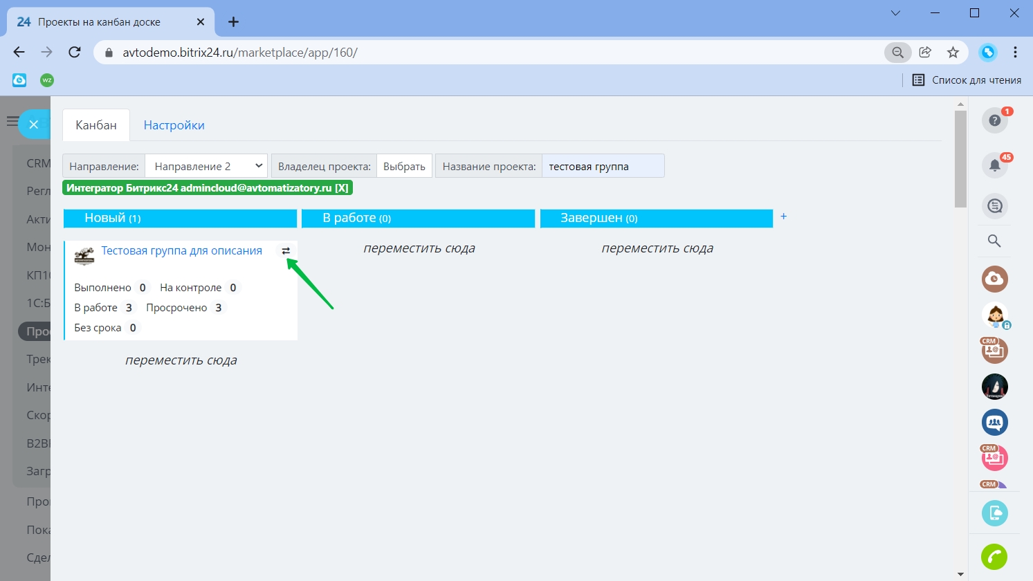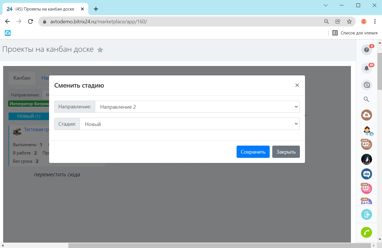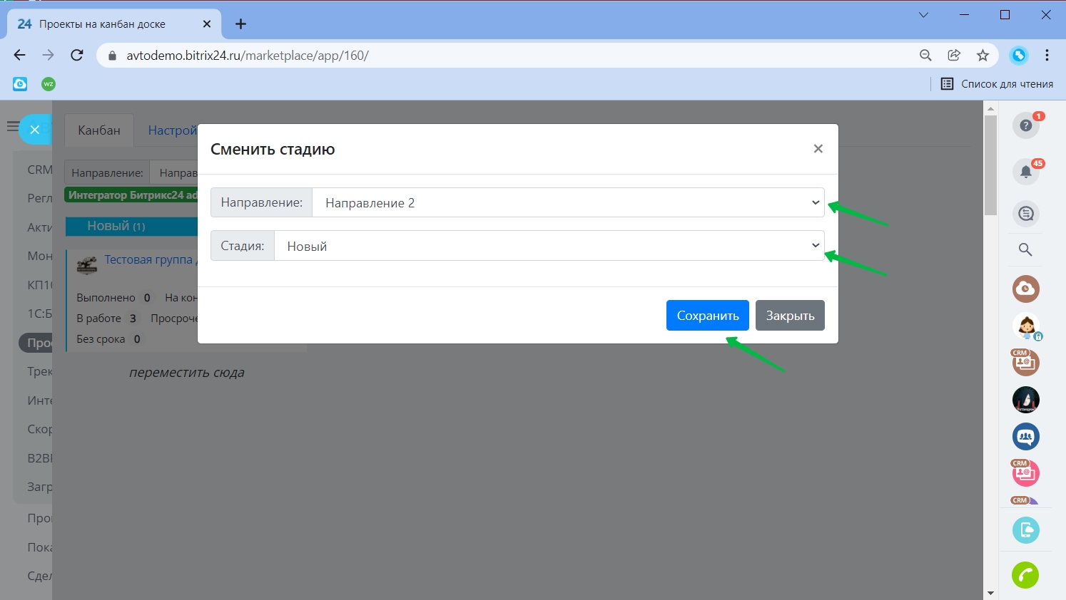 Нажмите на значок смены направления/стадии (как создать направление узнаете далее), откроется окно, в котором вы можете выбрать новое направление:
