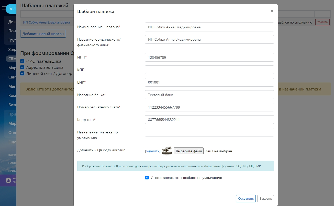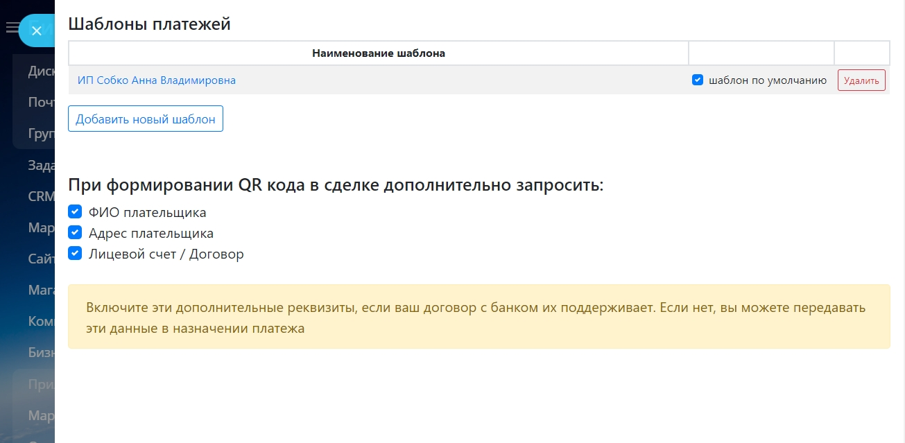 На этой странице необходимо добавить шаблоны оплаты с вашими реквизитами. Используете те же реквизиты, которые вы указываете в качестве реквизитов получателей платежа в ваших счетах на оплату.