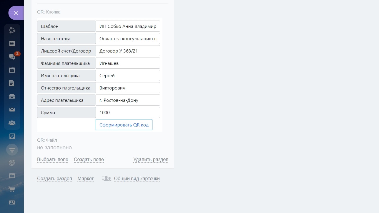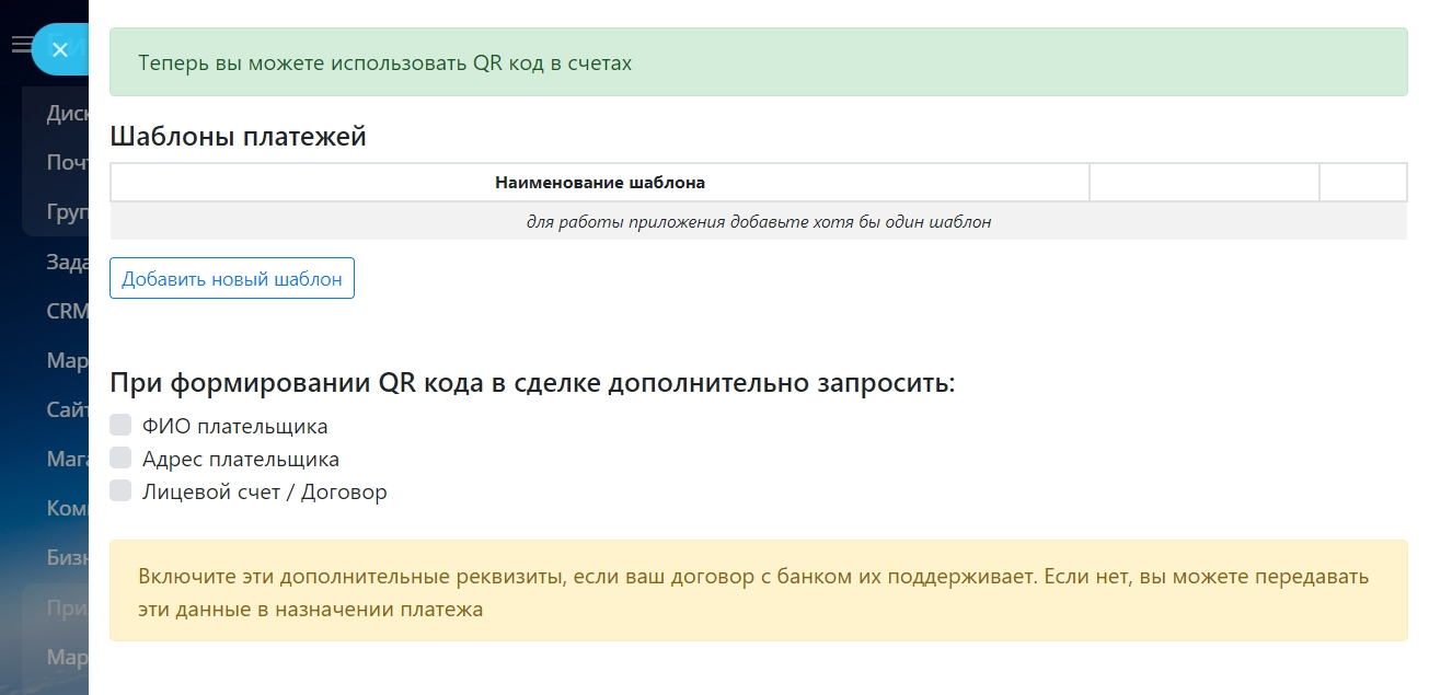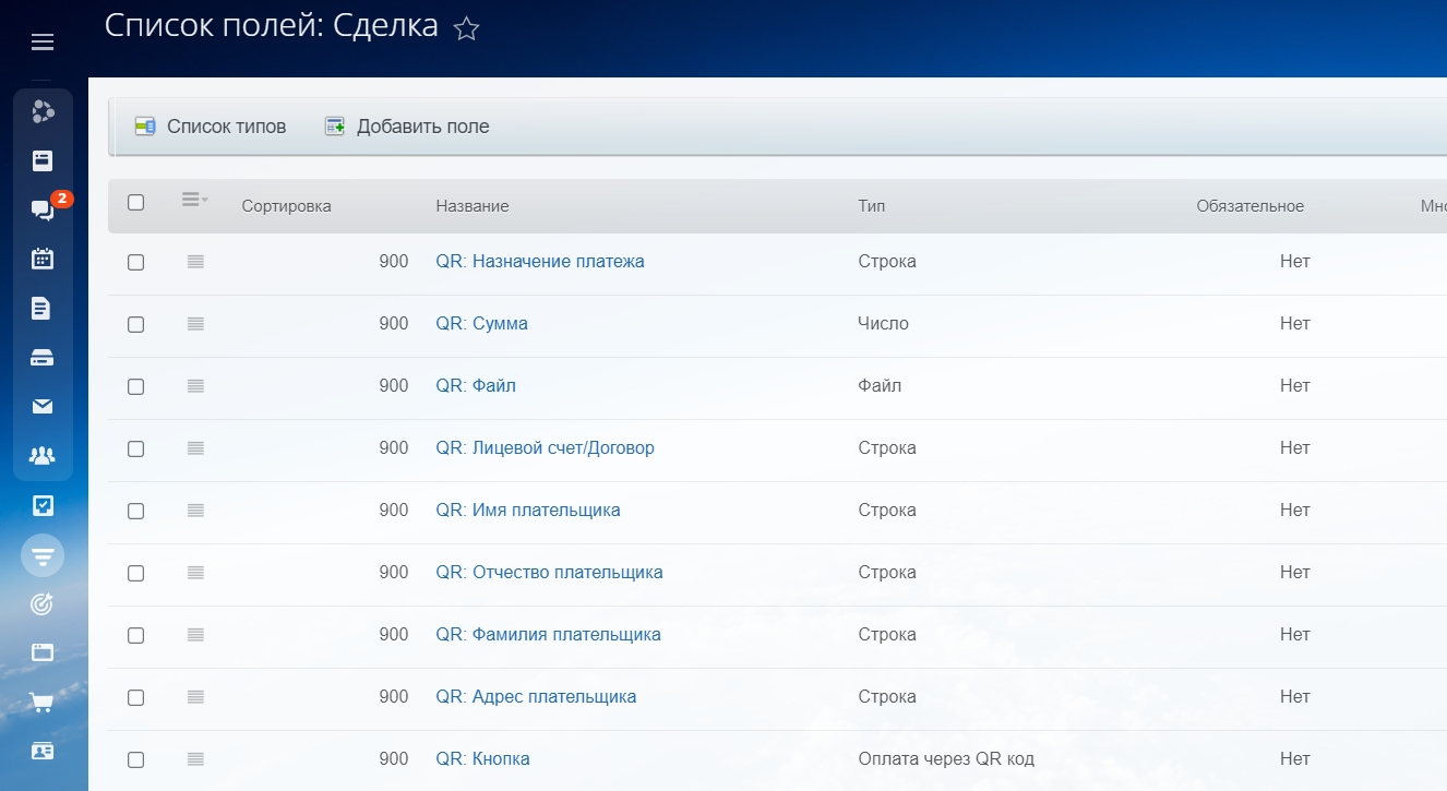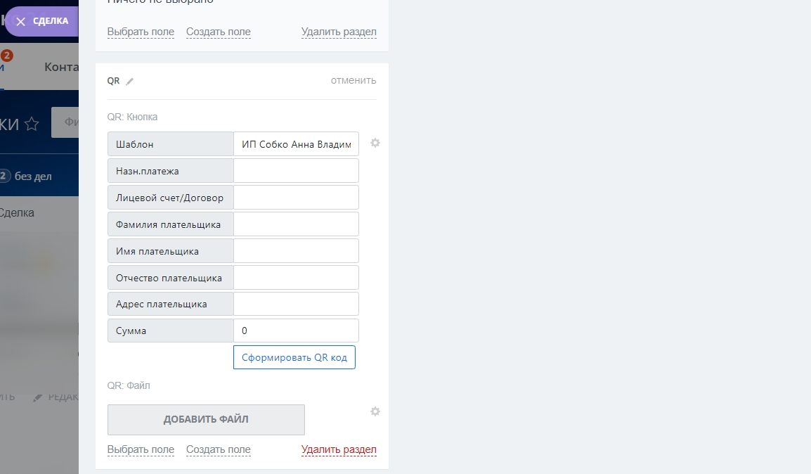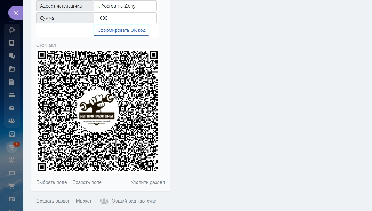 Отметьте в настройках нужно ли заполнять в сделке дополнительные поля для формировании QR кода