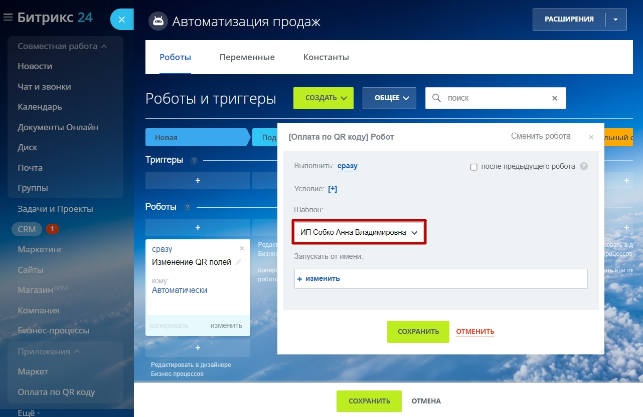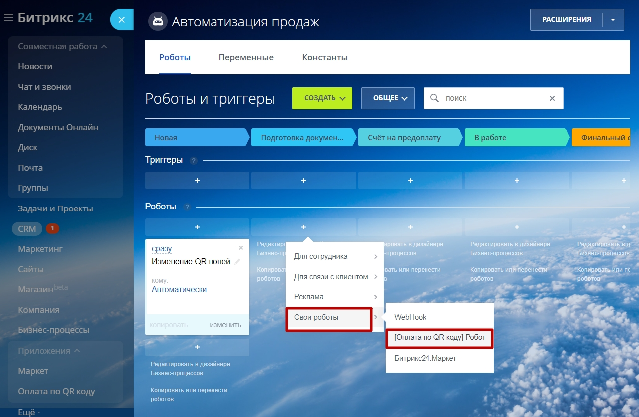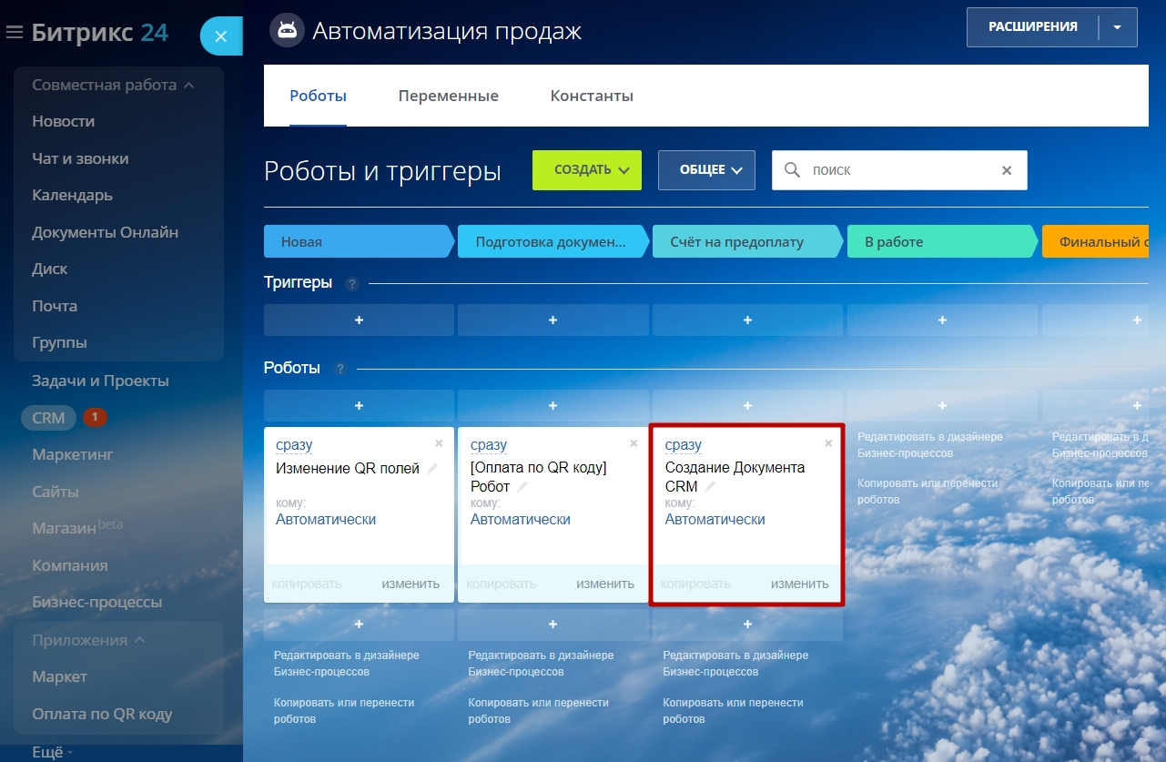 4. Добавьте робота “Создание Документа CRM”, который создаст документ “Счет на оплату“