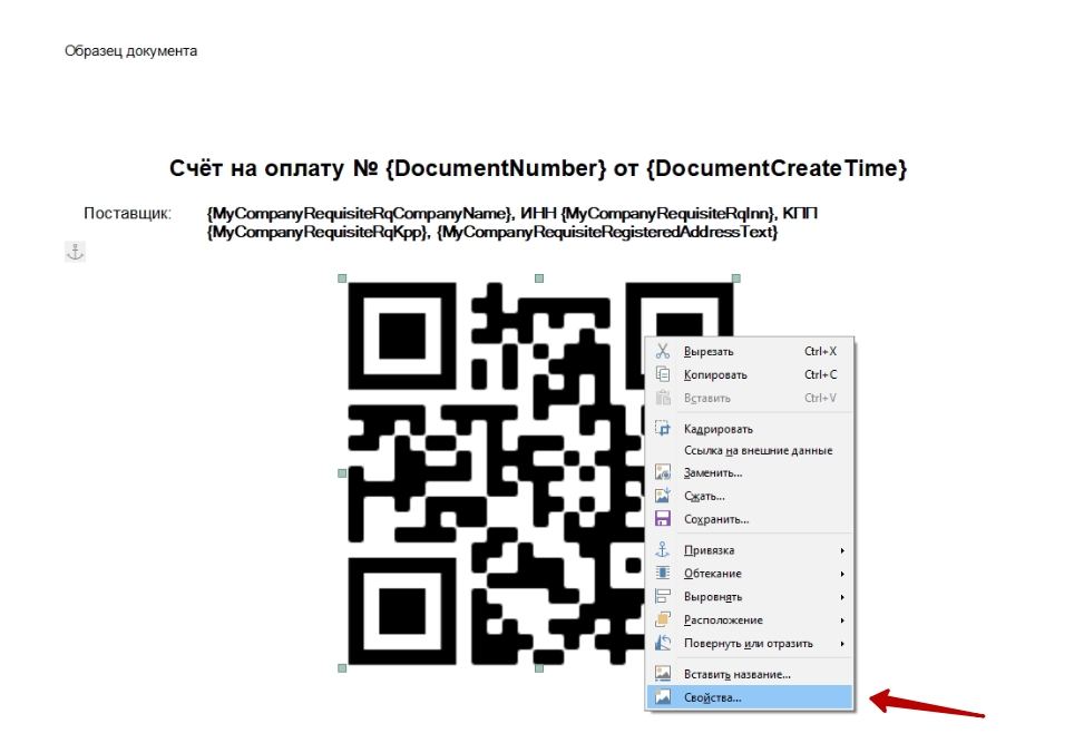 В документе шаблона вам необходимо разместить картинку-пример, какой размер будет иметь ваш реальный QR код в документе и где именно находиться. После этого вам нужно перейти в свойства изображения (нажав правой кнопкой мыши)