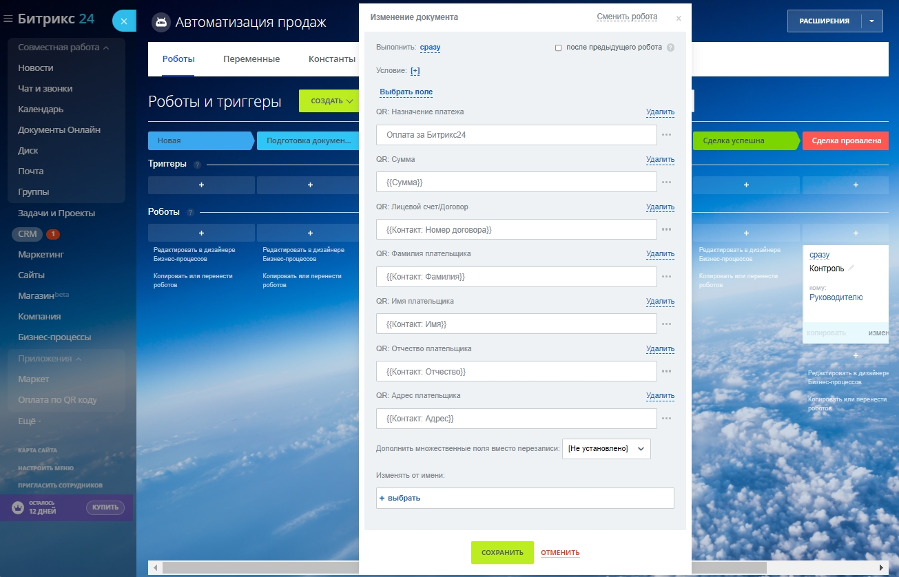 1. Добавьте робот “Изменение документа”, который заполнит данные в полях для формирования QR кода