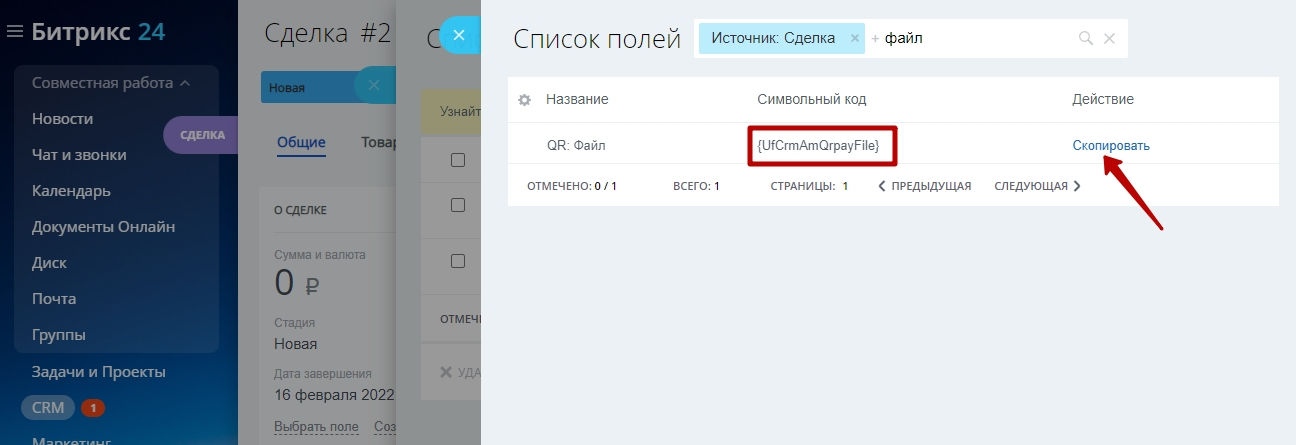 Приложение доступно для работы в сделках и счетах. Приложение создает картинку QR кода для оплаты счета и сохраняет ее в сущности. Эту картинку можно использовать при формировании документа “Счет”. Благодаря этому приложению, клиенты смогут оплачивать ваши счета быстро и без ошибок. (Возможность оплаты по QR коду поддерживается мобильными приложениями большинства российских банков)