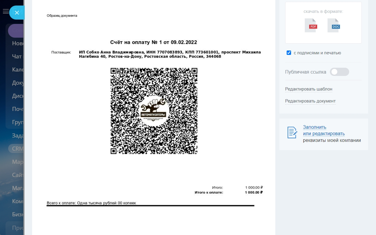 3. Создайте документ “Счет на оплату” по шаблону, в котором используется файл QR кода