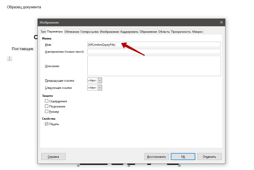 В свойствах изображения необходимо задать рисунку Имя, равное коду поля документа QR файл. Найти код можно в разделе Шаблоны документов: Список полей: