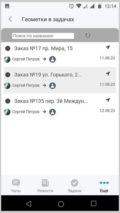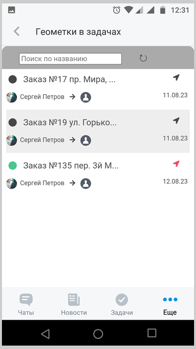 - Символ выбора задачи, серый - задача не выбрана, зеленый - задача выбрана, так же изменится символ местоположения (п9) на красный и можно отправить геометку. Мы считаем, что процесс отправки должен быть осмысленным и контролируемый, поэтому для отправки местоположения нужно выполнить два действия. Первое - выбрать задачу, второе - отправить местоположение.