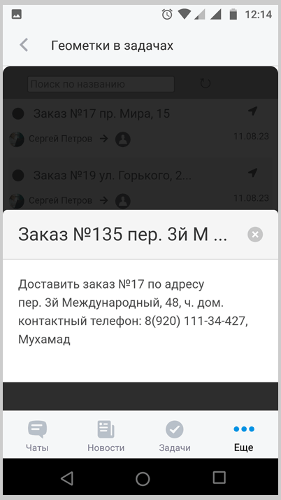 Есть центр по приему заявок, они обрабатываются согласно принятому регламенту. В том числе есть услуга доставки товара. На этом этапе курьерам приходит задача с описанием доставки, где указан номер заказа, адрес и контактный телефон клиента. Курьер в отгрузке забирает товар и едет к клиенту. В мобильном приложении доступно описание задачи и контактная информация клиента.Курьер на месте может посмотреть описание задачи и, после передачи товара, оставить геометку своего нахождения, которая прикрепится комментарием к задаче.