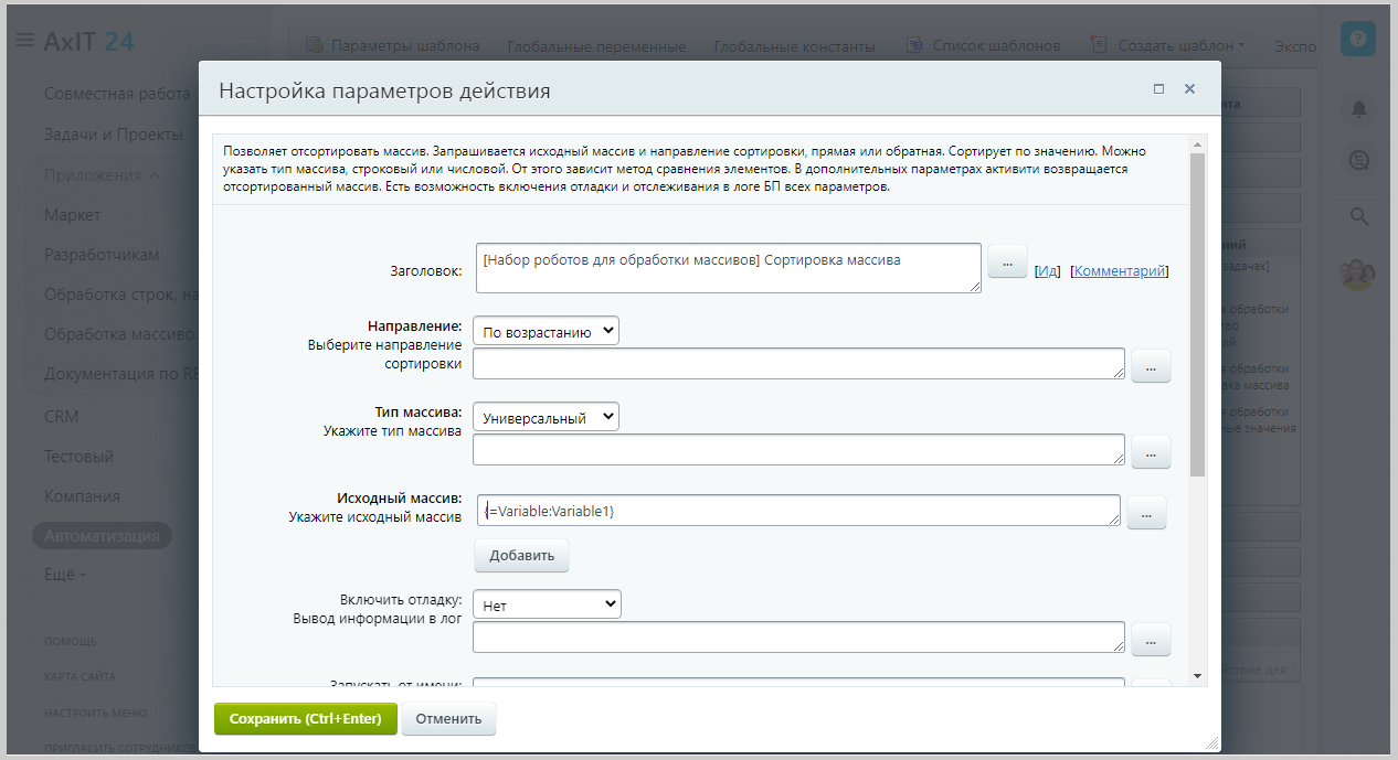 Позволяет отсортировать массив. Запрашивается исходный массив и направление сортировки, прямая или обратная. Сортирует по значению. Можно указать тип массива, строковый или числовой. От этого зависит метод сравнения элементов. В дополнительных параметрах активити возвращается отсортированный массив. Есть возможность включения отладки и отслеживания в логе БП всех параметров.