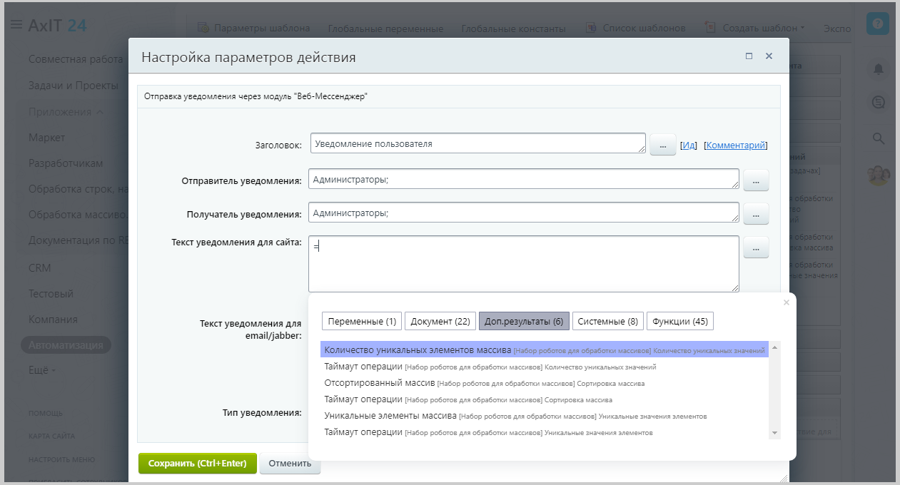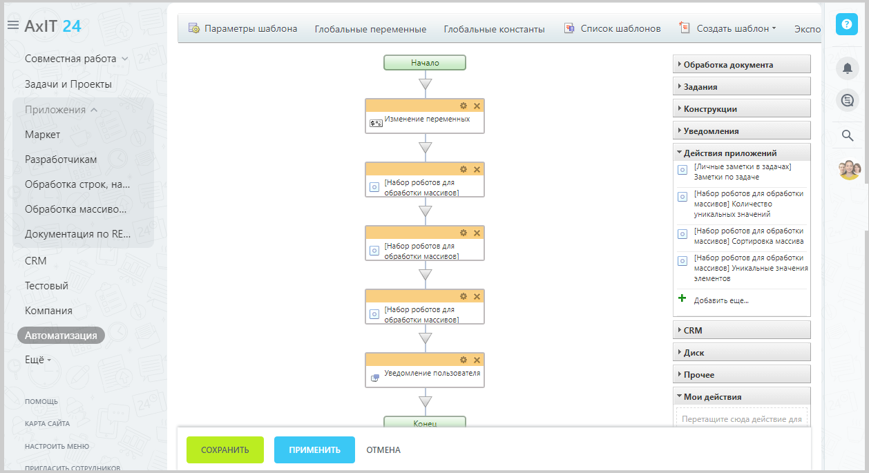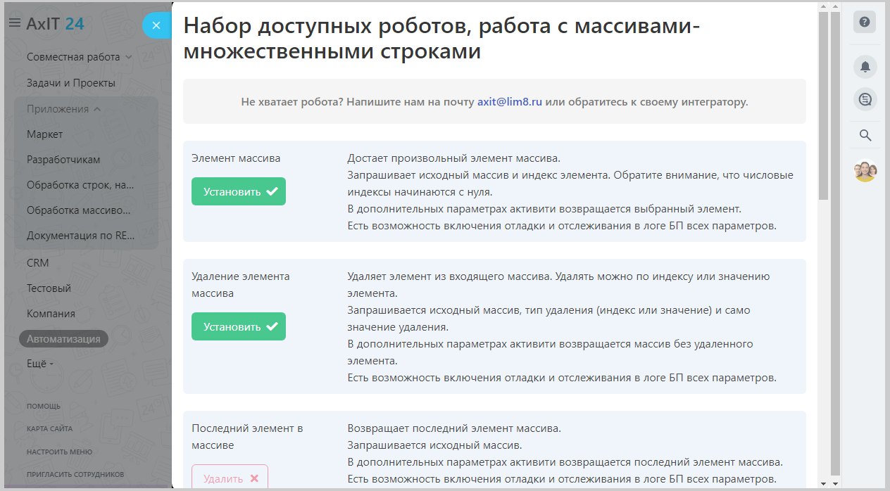 При создании больших бизнес-процессов возникает необходимость различной обработки массивов, также их еще называют "множественные поля". Штатный функционал предоставляет минимальный набор инструментов для работы, поэтому мы решили выпустить набор активити для работы с массивами, в него входят основные действия, которые мы встречали в своей практике и которые не были реализованы в штатном функционале Битрикс24.