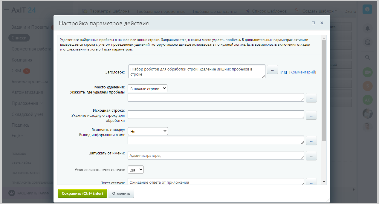 Удаляет все найденные пробелы в начале или конце строки. Запрашивается, в каком месте удалять пробелы, в начале или в конце строки. В дополнительных параметрах активити возвращается строка с учетом проведенных удалений, которую можно дальше использовать по нужной логике. Есть возможность включения отладки и отслеживания в логе БП всех параметров.