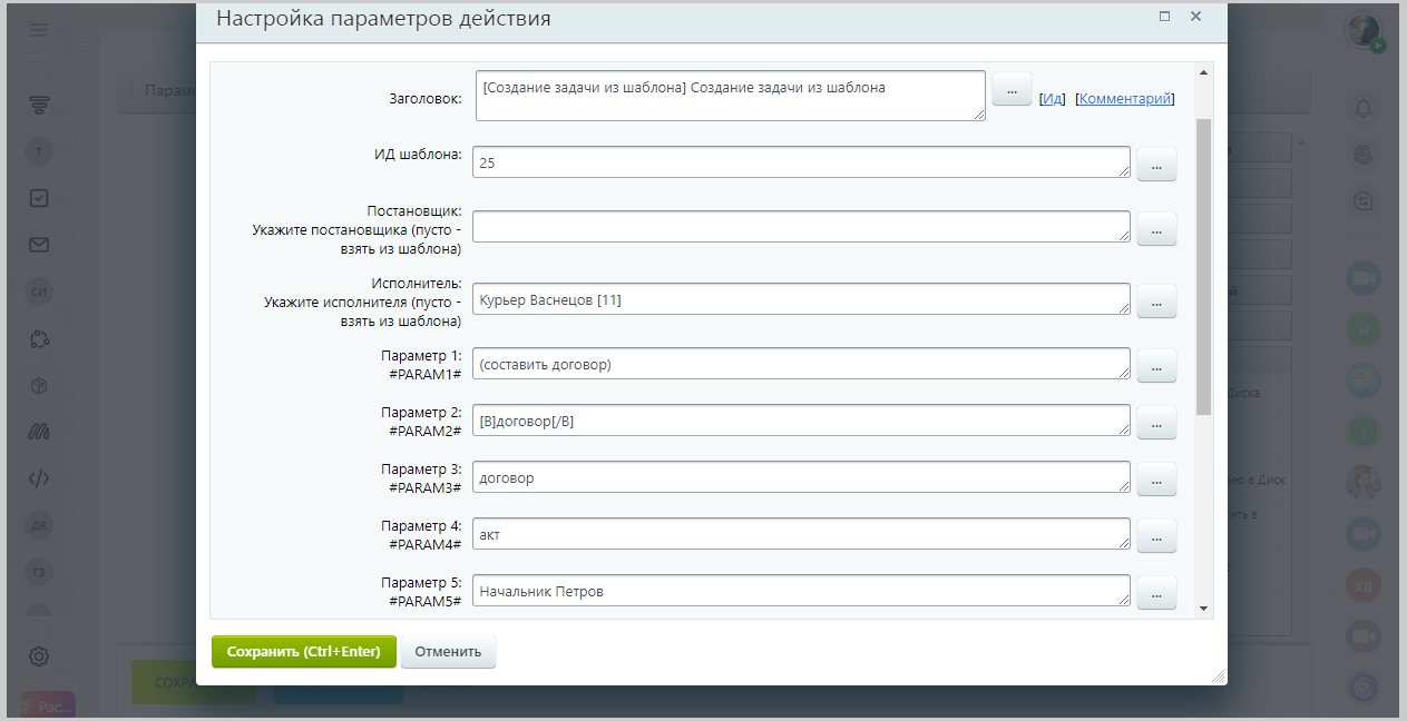 Важно! на текущий момент параметры работают только в заголовке и описании задачи - будет создана задача с указанными параметрами