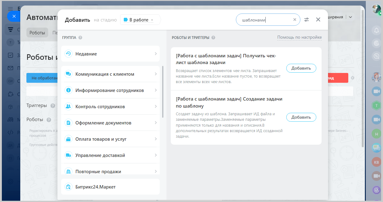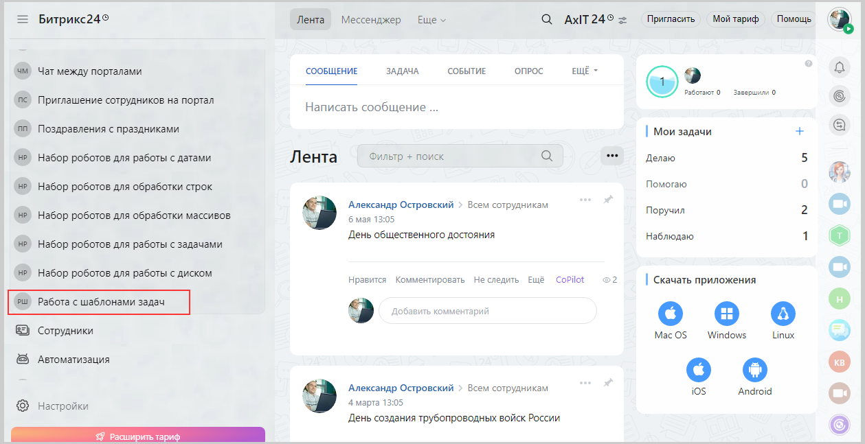 - Установите приложение, после чего появится новый пункт в левом меню, в разделе "Приложения" - "Работа с шаблонами задач" (см. скрин №1).