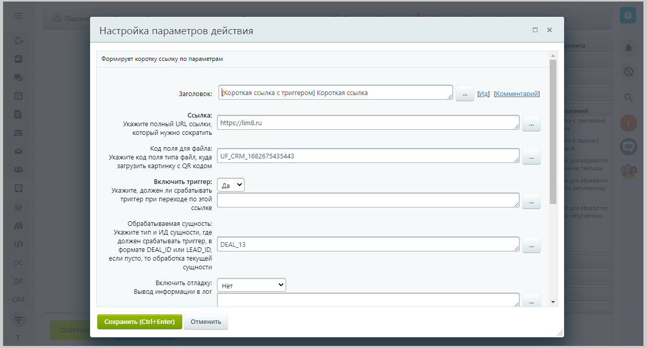- Включить триггер - при включении данного параметра в короткую ссылку добавляется обработка. Триггер срабатывает при переходе клиента по указанной короткой ссылке. Предварительно триггер должен быть настроен в соответствующей воронке в сделках или лидах. Данный параметр проверяет корректность поля "обрабатываемая сущность", в случае некорректности данных в лог записывается сообщение об этом, ссылка не формируется и выполнение приложения завершается.