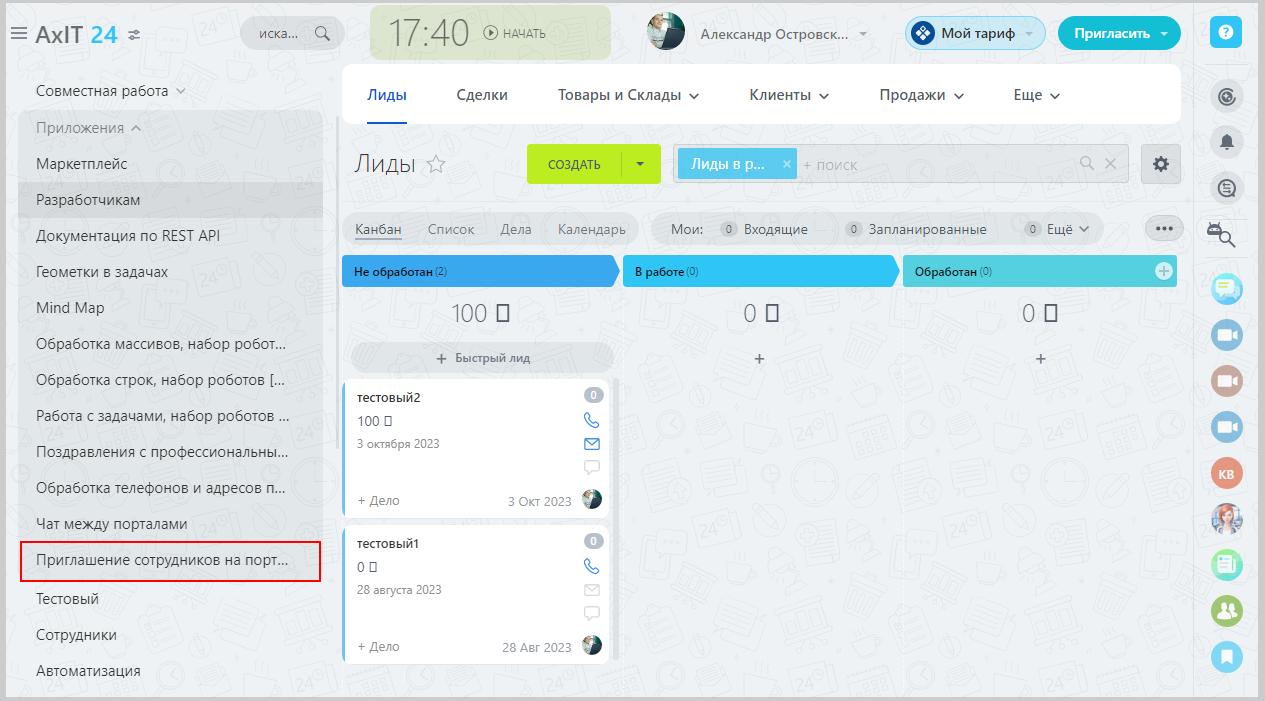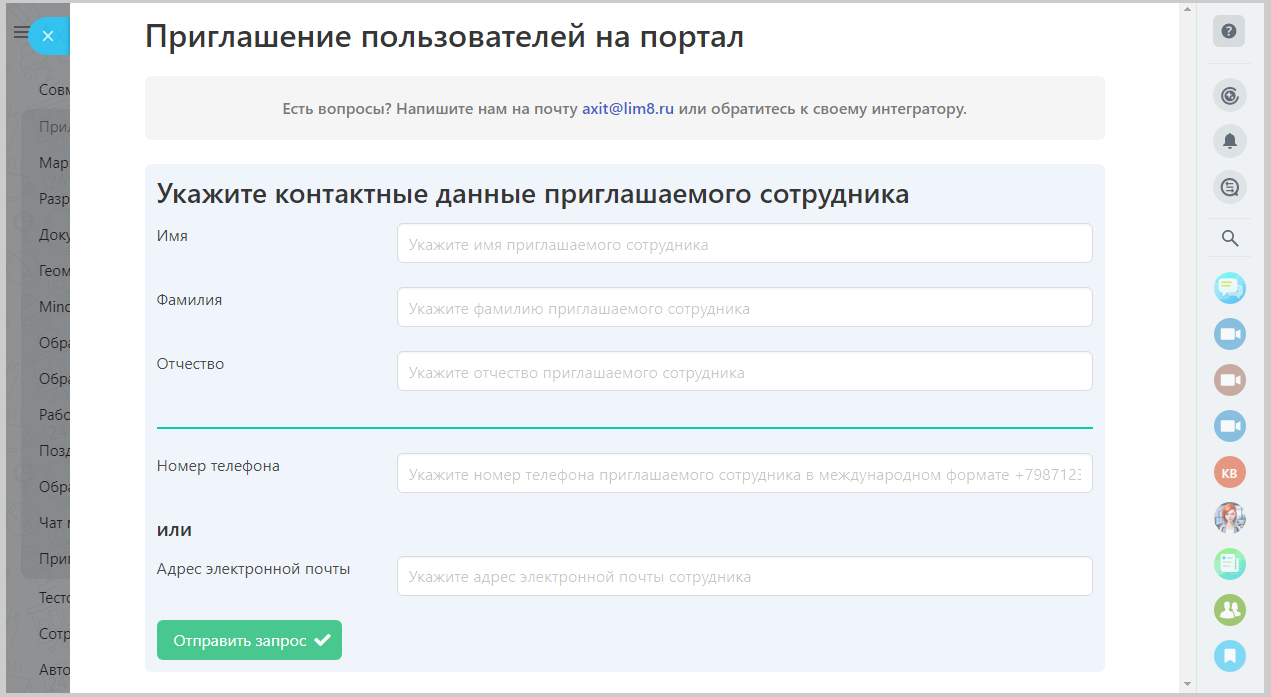 - Установите приложение, после чего появится новый пункт в левом меню, в разделе "Приложения" - "Приглашение сотрудников на портал" (см. скрин №1).