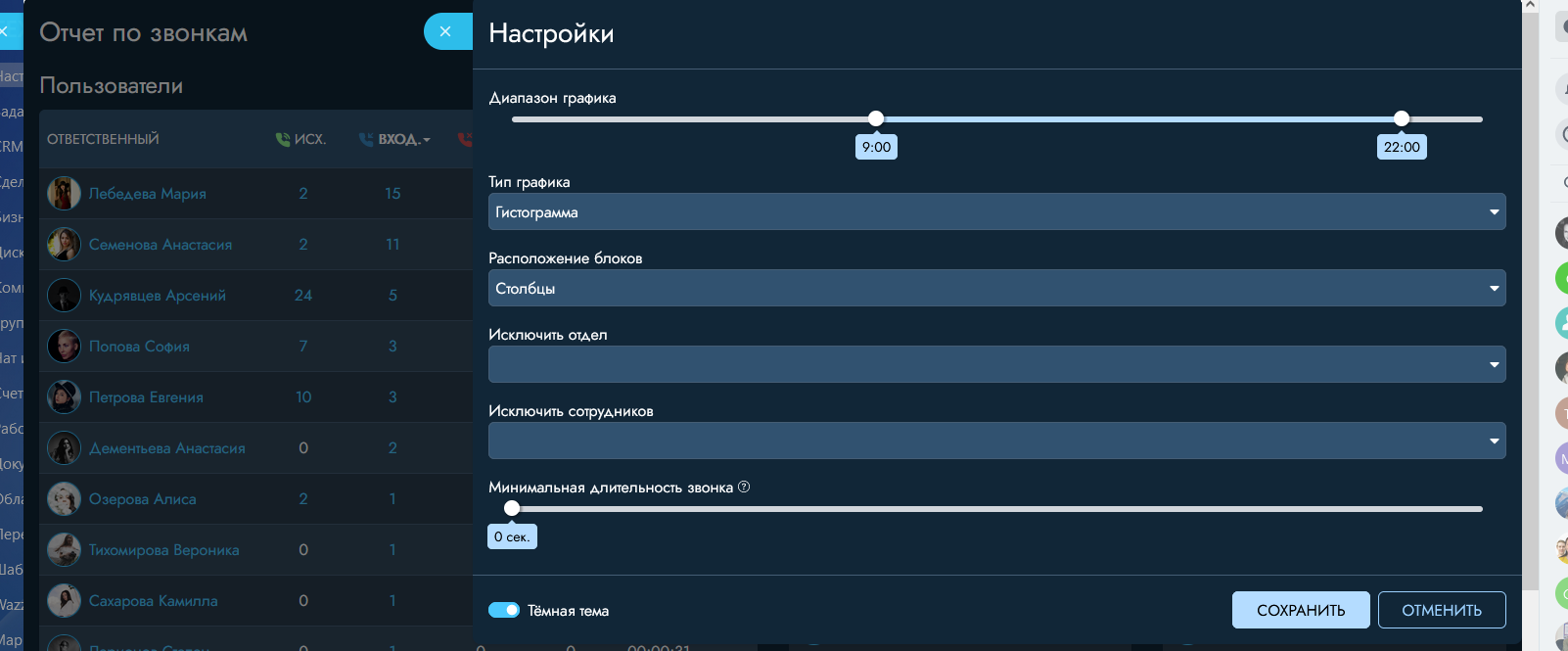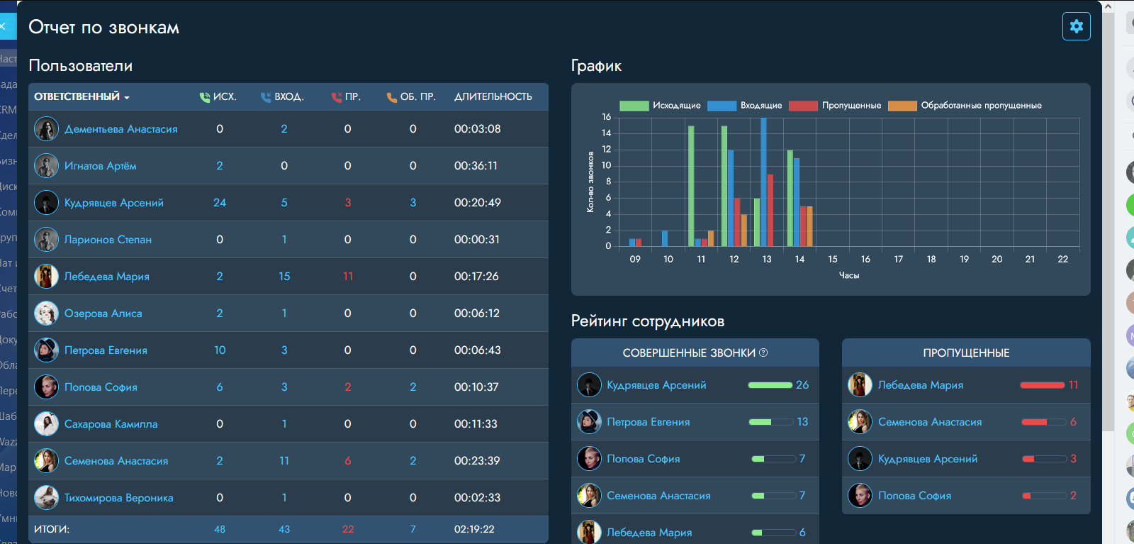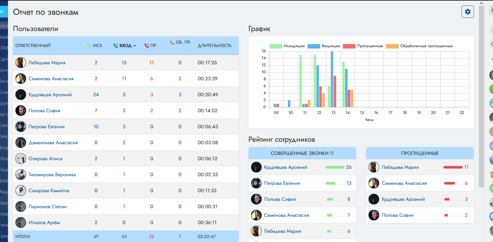 метрики по сотрудникам за сегодня или диапазон времени, суммарное время разговоров, исходящие и входящие, количество общее звонков, а так же в моменте виден весь список по сотруднику с возможностью прослушать звонок и провалиться в саму сущность
