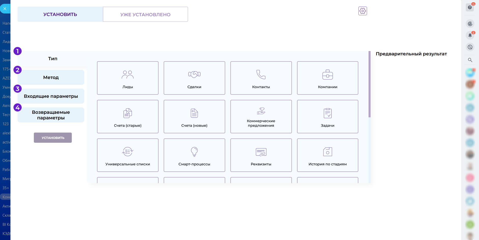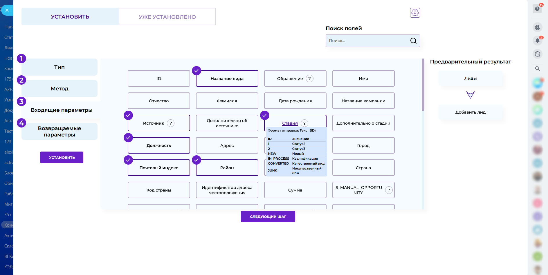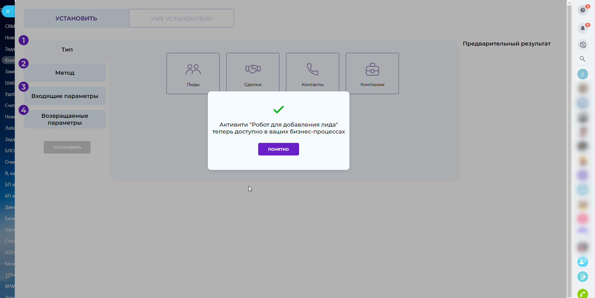 - Выберите сущность (лид, сделка, контакт и т.п.);