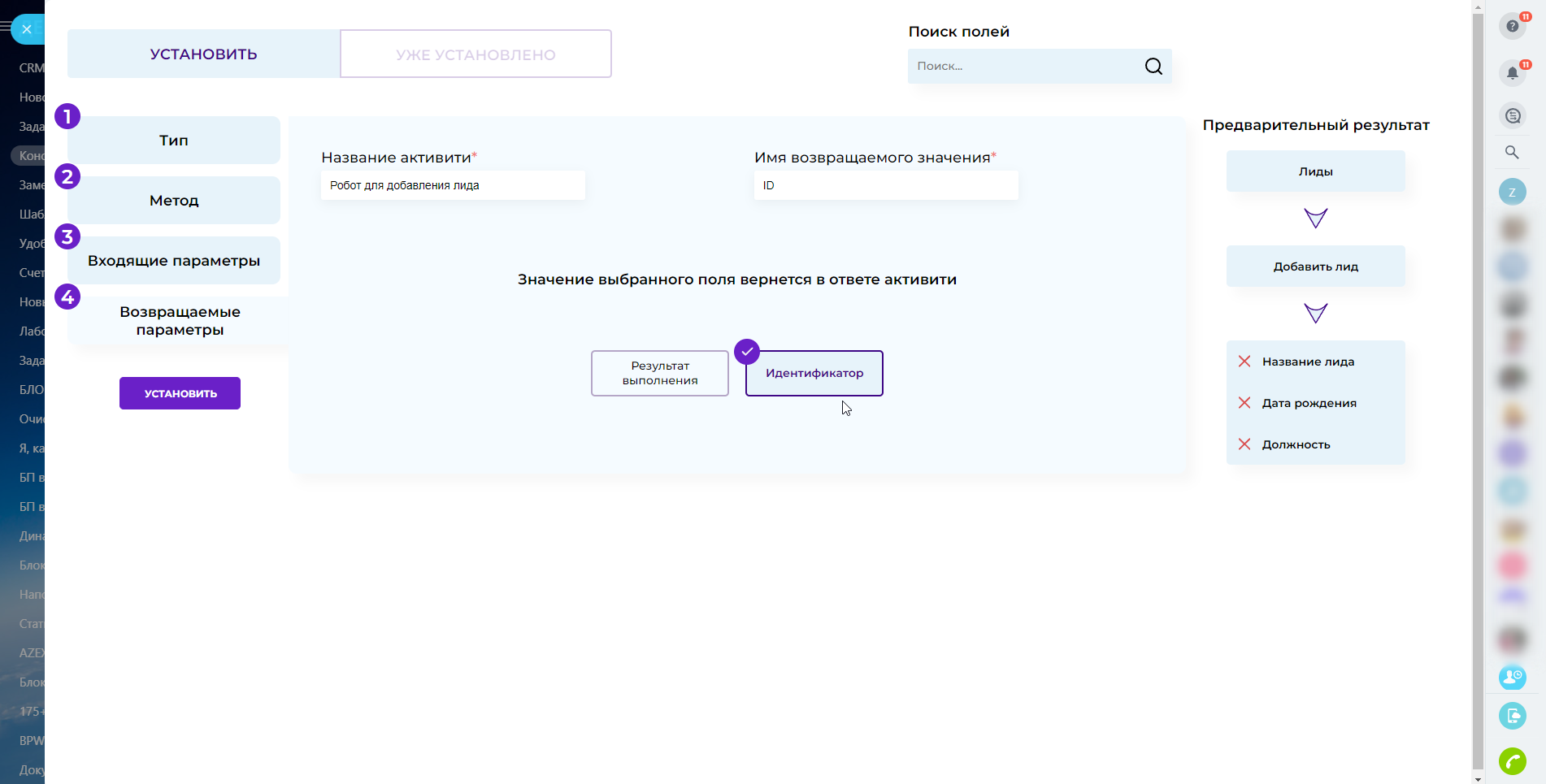 - Получаемый параметр (что вернет робот/активити БП);