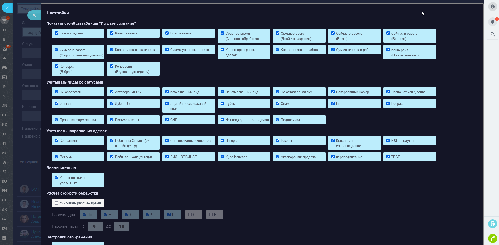 - Скорость обработки - время между созданием лида и первой сменой статуса лида (в рабочих минутах);