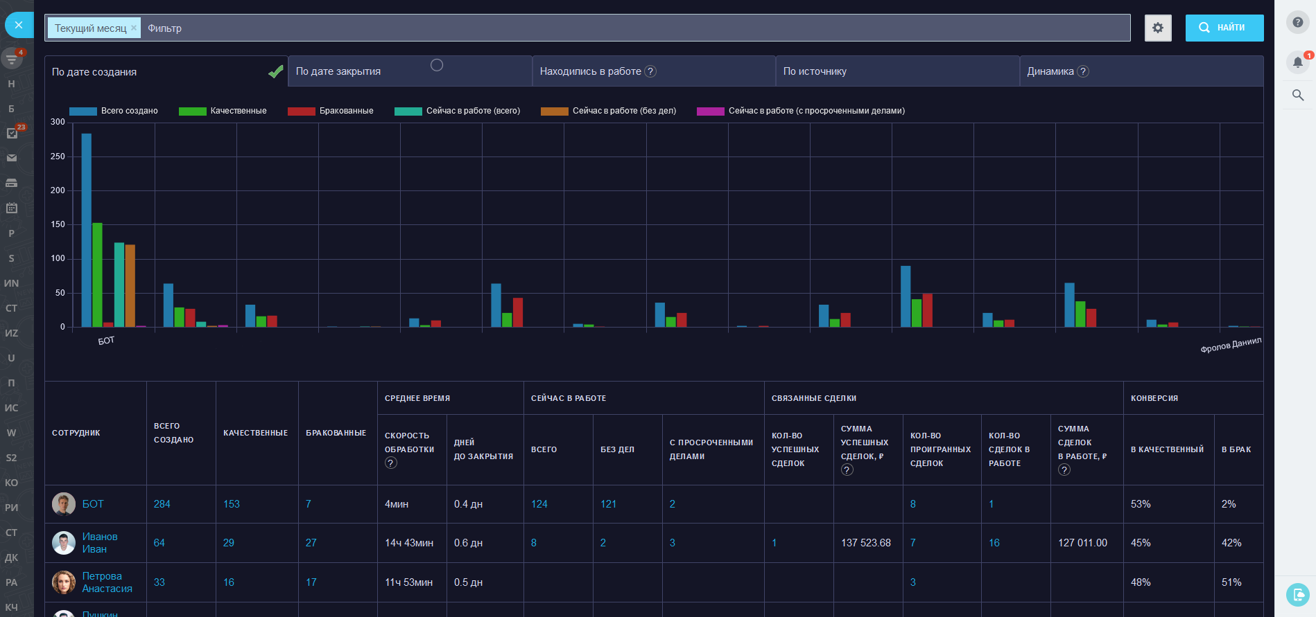 - Конверсии: в качественный лид (сделку), в брак, в успешную сделку.