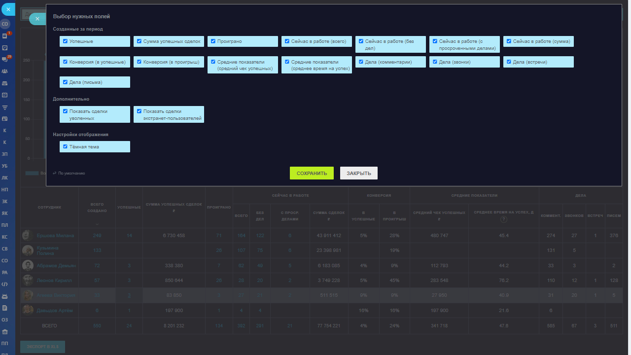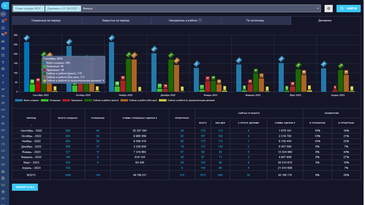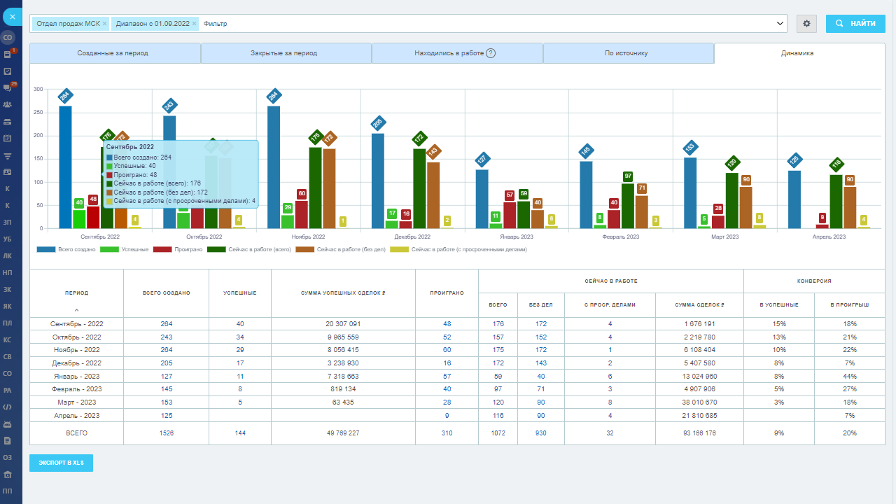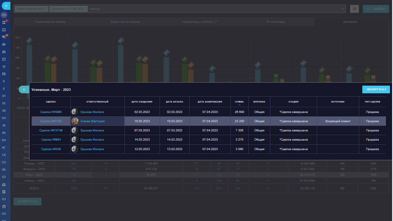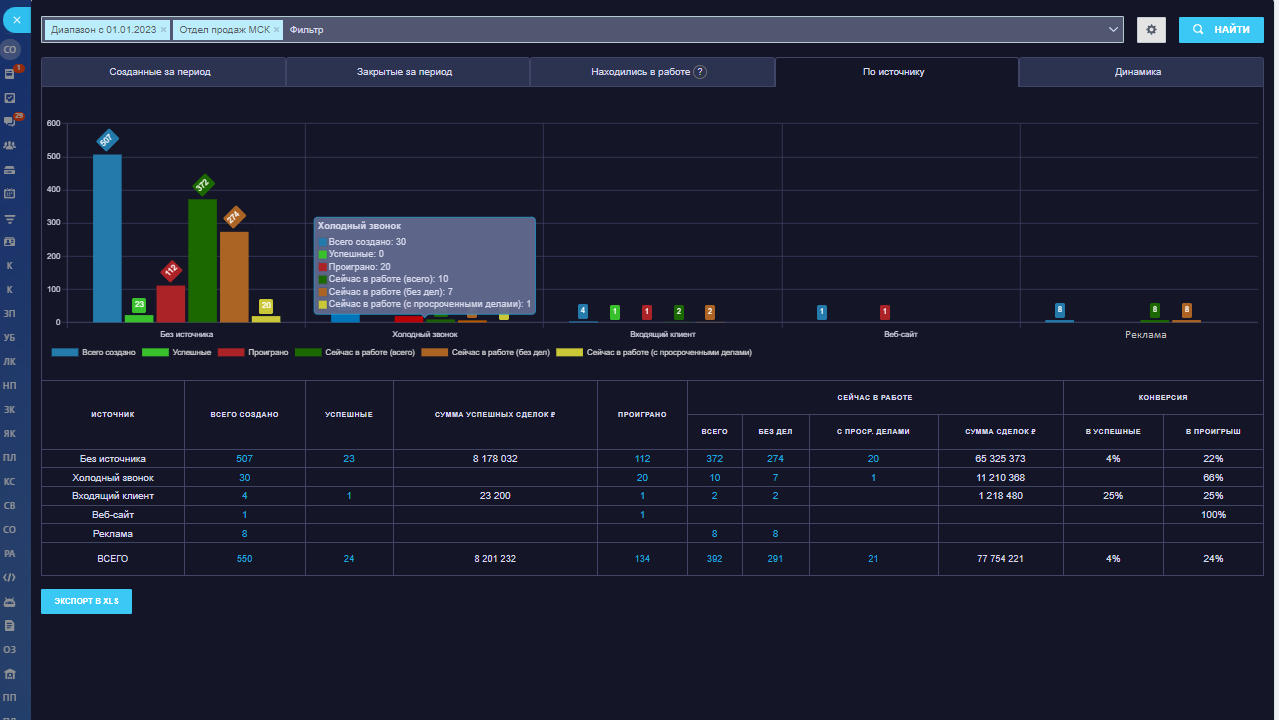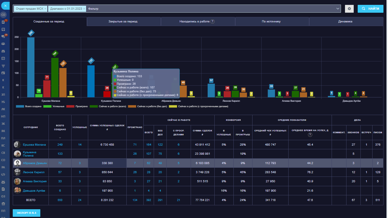 - в зависимости от вкладки соотношение к: сотруднику, источнику, периоду (месяц);