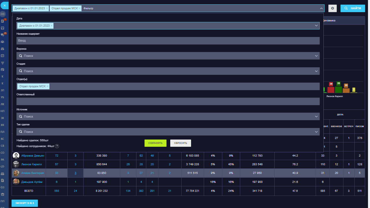 - Дополнительные фильтры: Дата, Часть названия сделки, Воронка, Стадия, Отделы, Ответственный, Источник, Тип сделки;
