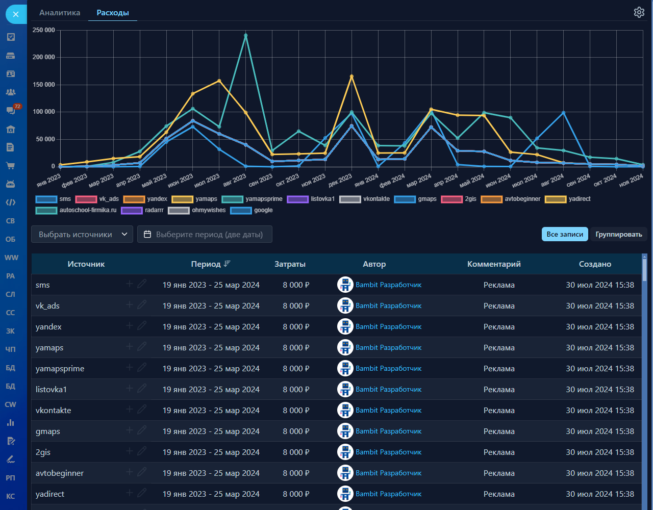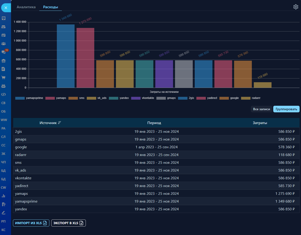 - Графики и таблицы с глубоким погружением в детализацию источников;