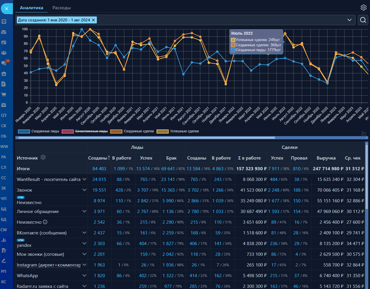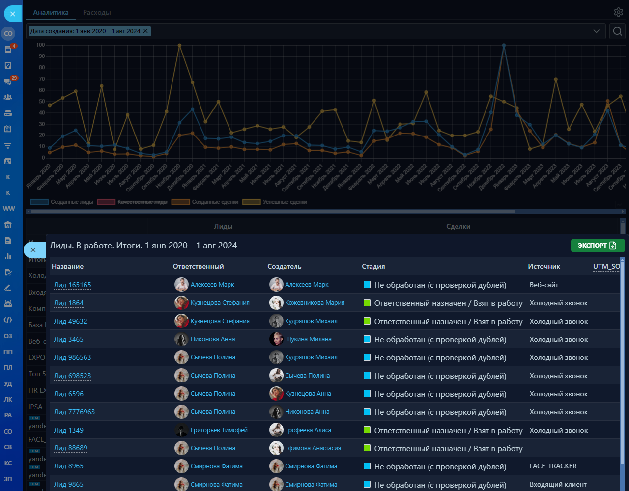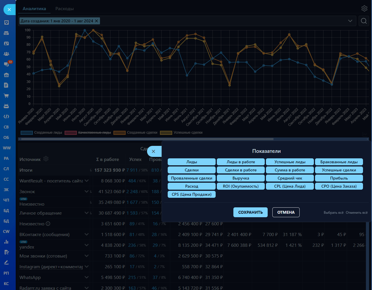 - Созданные Лиды, Лиды в работе, Успешные Лиды, Бракованные Лиды, Созданные Сделки, Сделки в работе, Успешные Сделки, Проваленные Сделки, Сумма Сделок в работе, Сумма Успешных Сделок, Средний чек, Прибыль Сделок, Расходы.