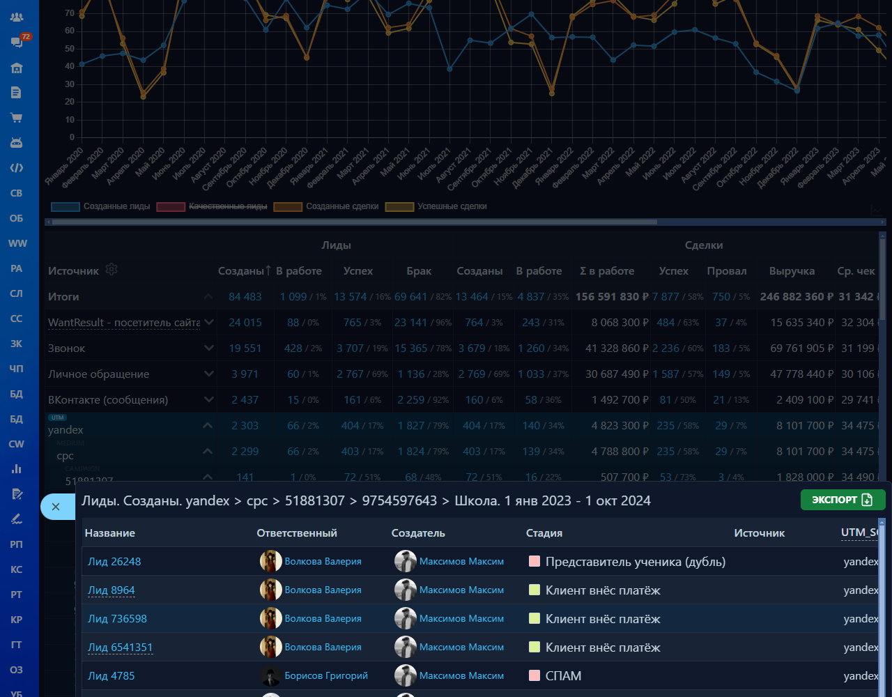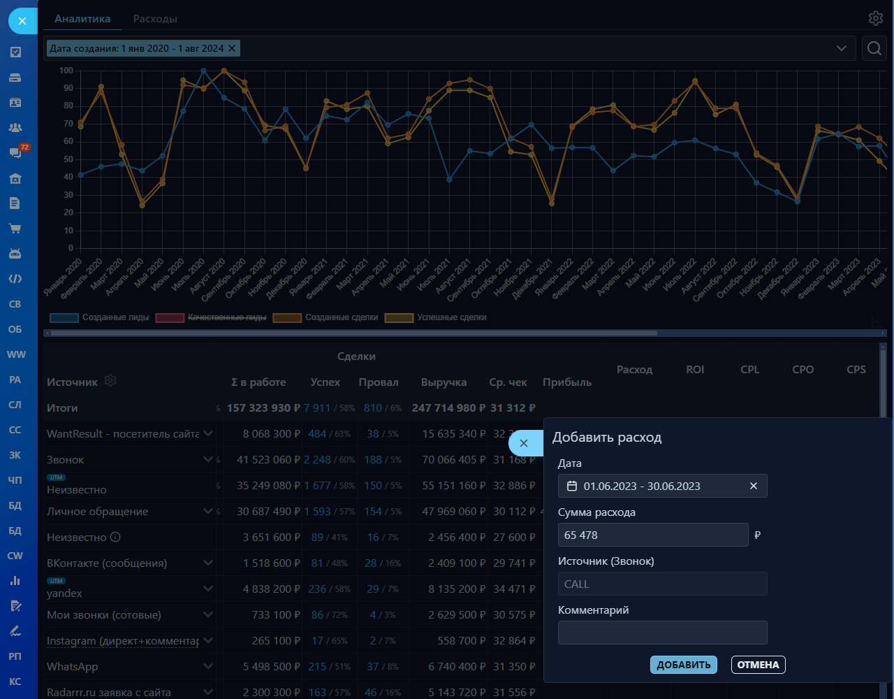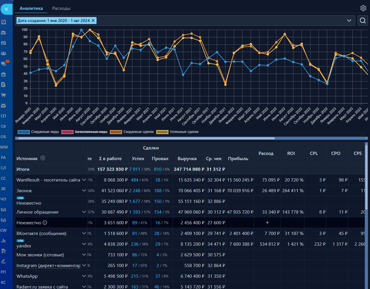 - Созданные Лиды, Лиды в работе, Успешные Лиды, Бракованные Лиды, Созданные Сделки, Сделки в работе, Успешные Сделки, Проваленные Сделки, Сумма Сделок в работе, Сумма Успешных Сделок, Средний чек, Прибыль Сделок, Расходы.