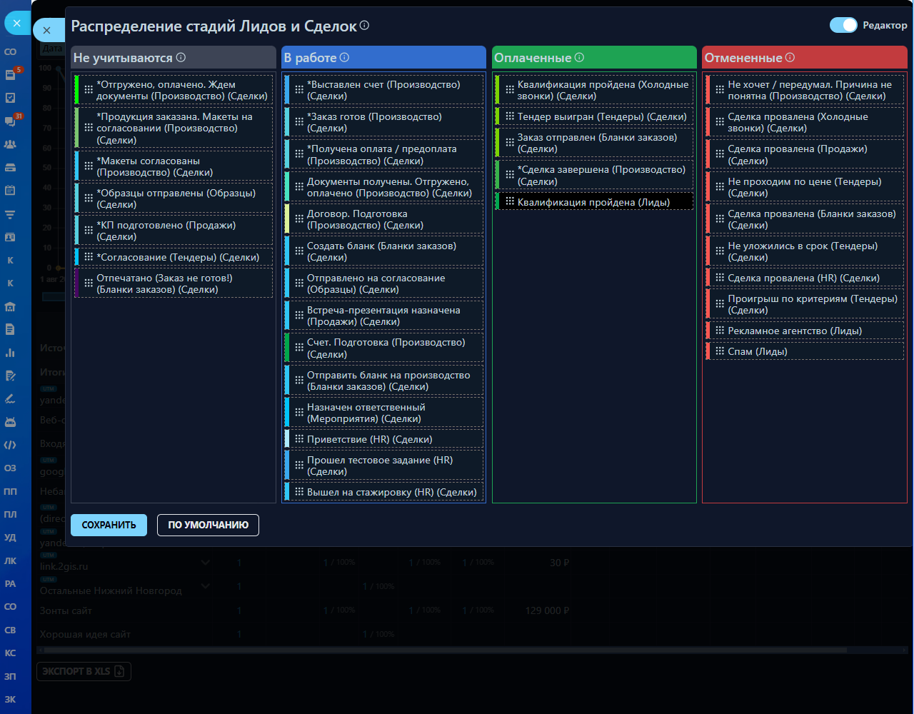 - Возможность распределить группы стадий для Лидов и Сделок.
