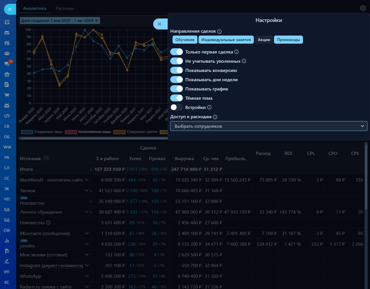 - Сквозная аналитика с расходами и авто-калькуляцией;