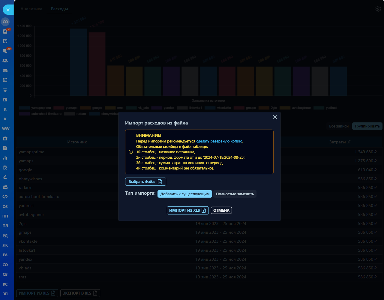 - Полностью заменить - при импорте прошлые расходы удаляются и новые добавляются.