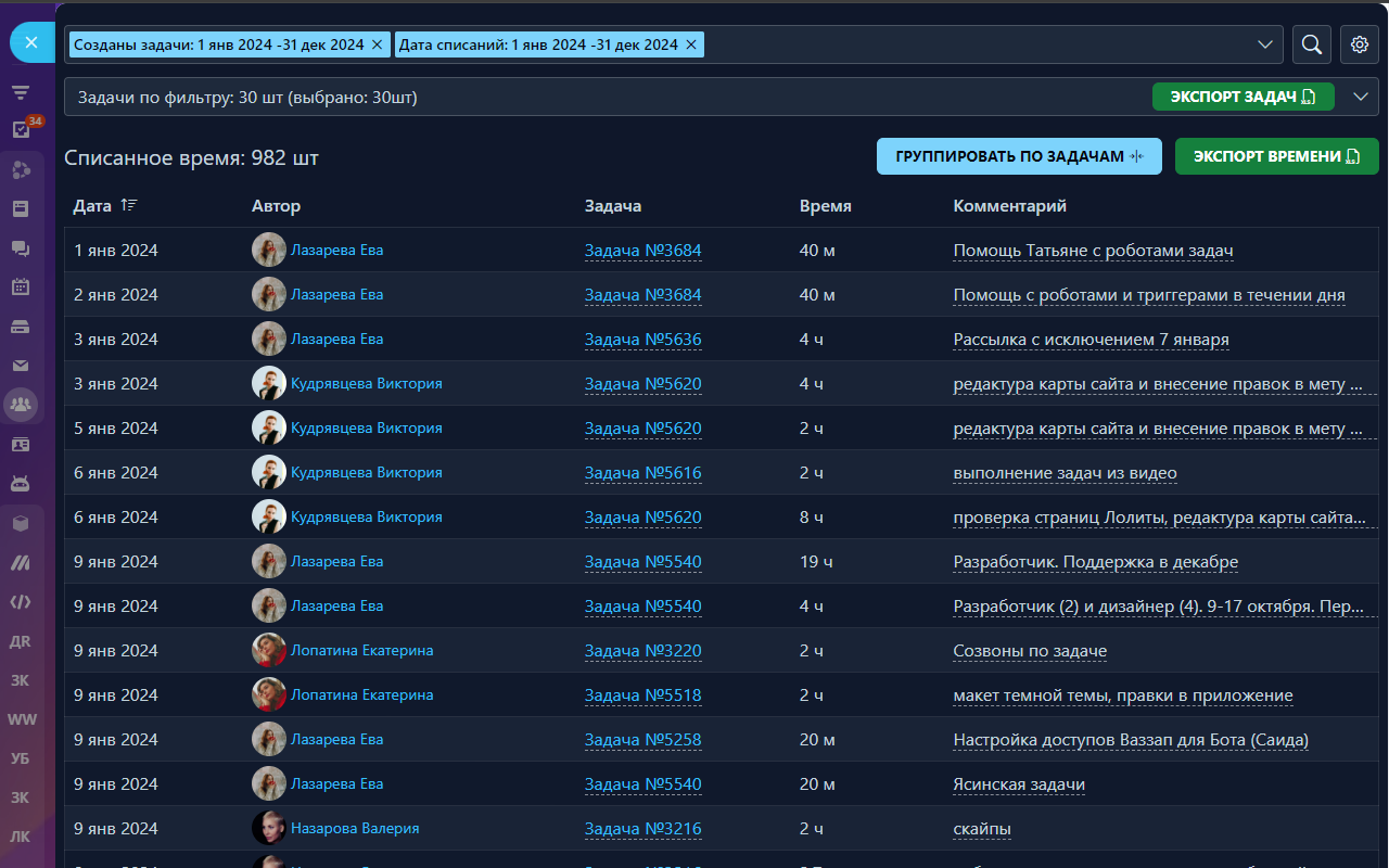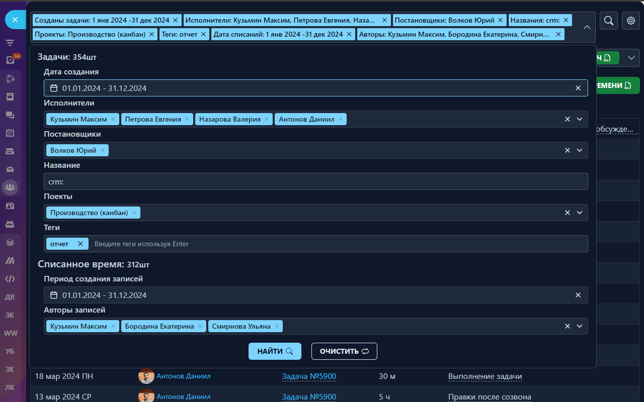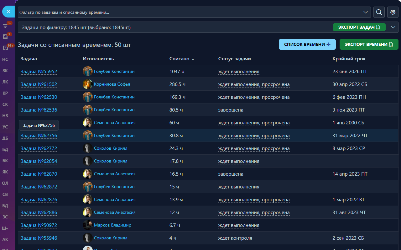 Анализ и экспорт времени по задачам с расширенными фильтрами