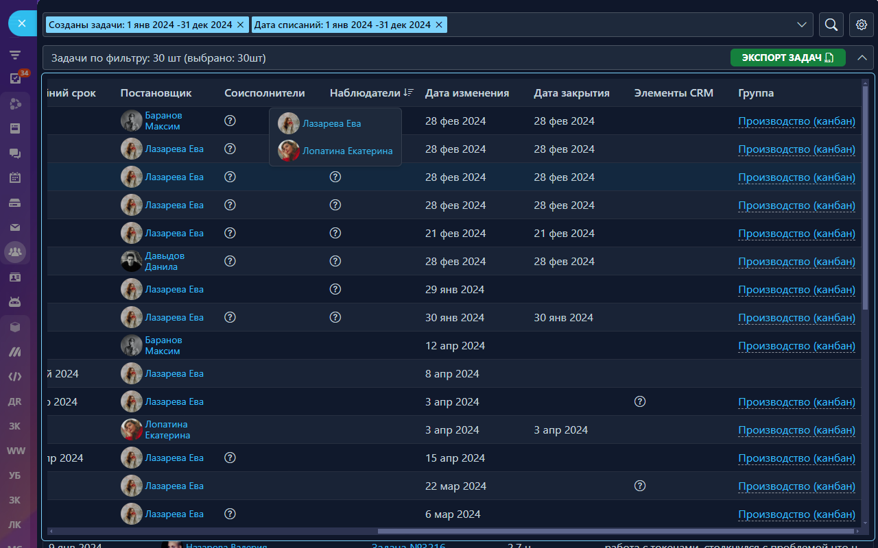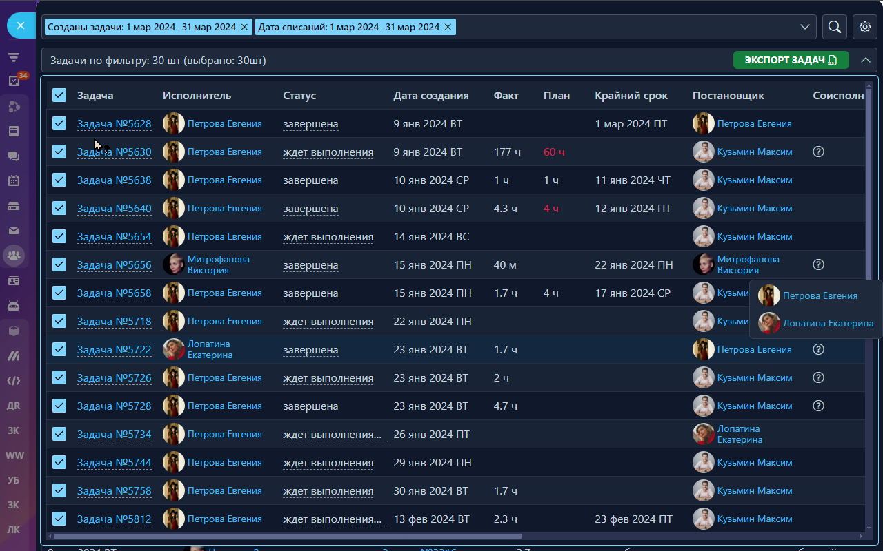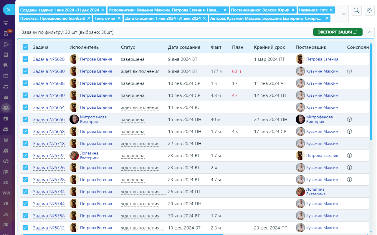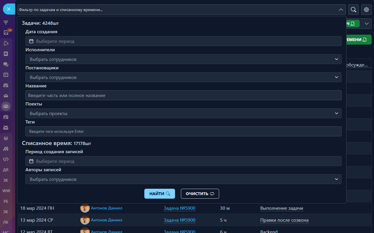 Анализ и экспорт времени по задачам с расширенными фильтрами