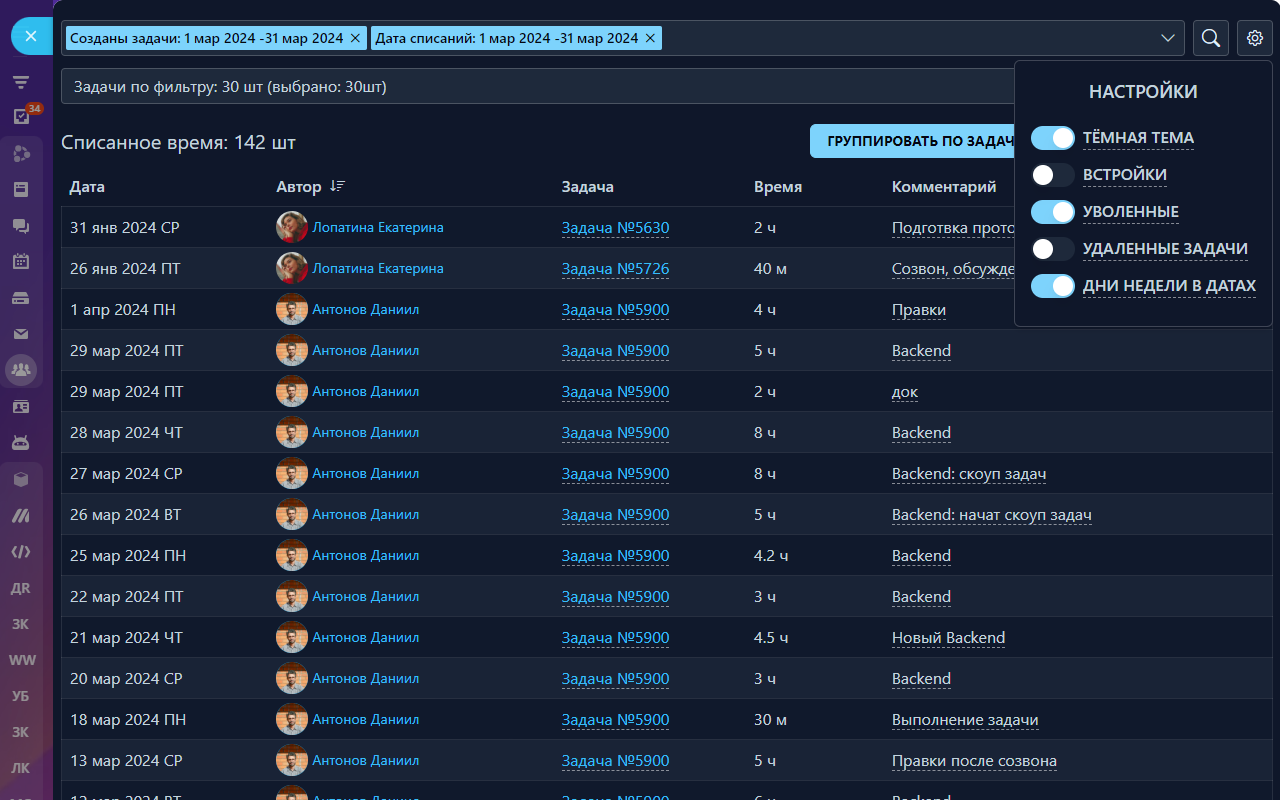 - удаленные задачи - чтобы находилось списание времени по удаленным задачам;