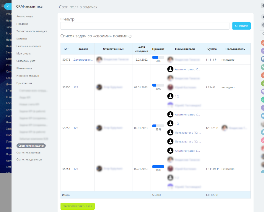 - При необходимости в отчете (раздел аналитика) доступен отчет по задачам с этими полями, включая выгрузку в XLS