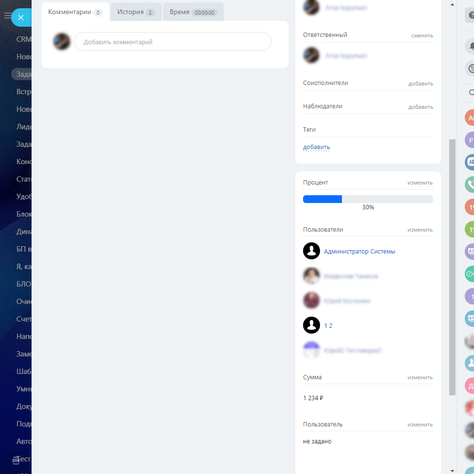 - В настройках можно указывать права доступа. Каждой роли (постановщик, ответственный, соисполнитель, наблюдатель) в задаче можно выбрать доступ: запись (полный доступ) или чтение.